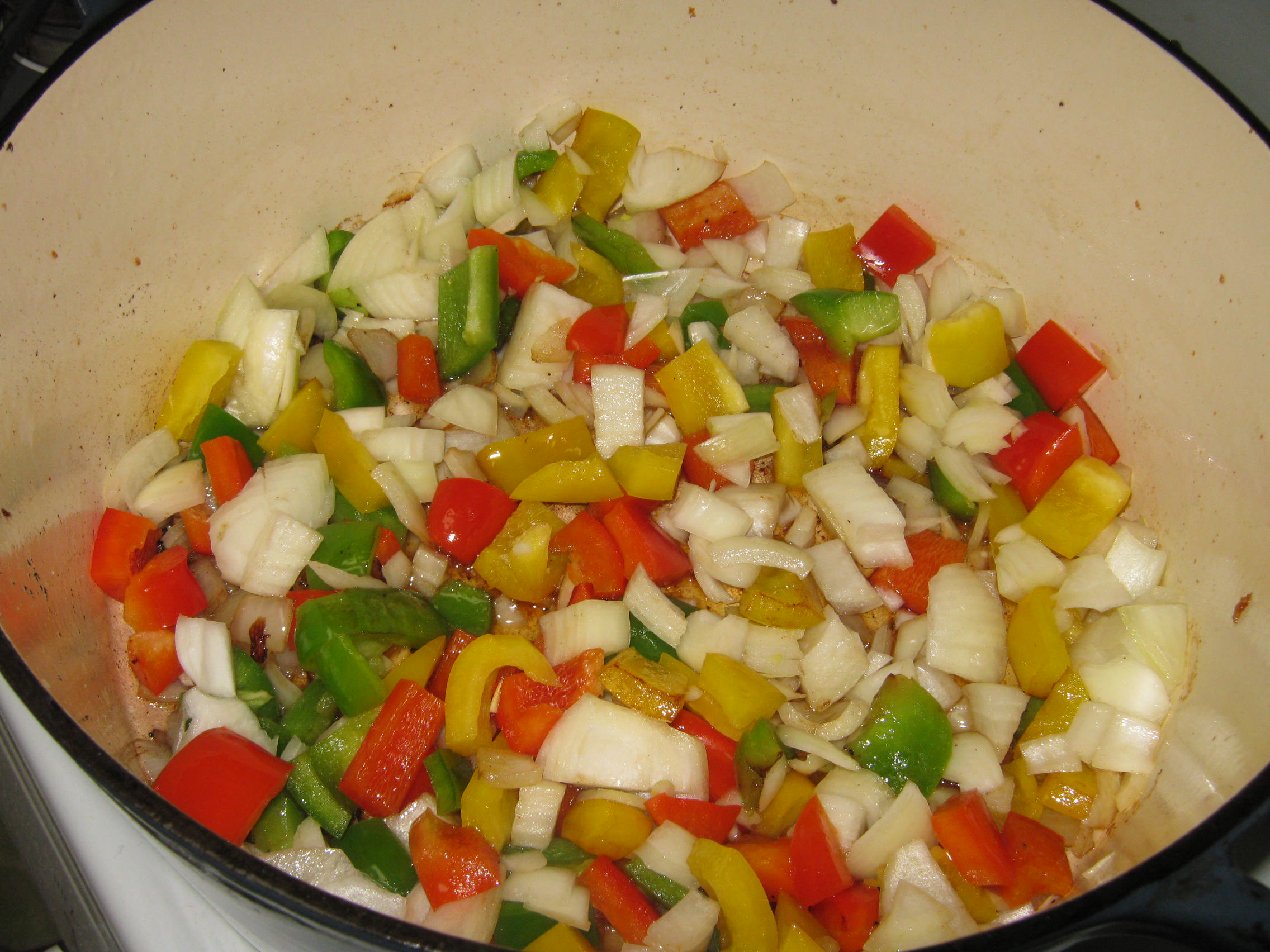 While the chicken is browning, dice the onions and peppers into roughly similar sized pieces. I don’t measure these ingredients terribly closely, but usually end up with about two cups each of onion and peppers. The original recipe calls for equal amounts of green and red peppers, but I like to use a combination of as many peppers as I can find (red, green, yellow, orange), and dice enough to get two cups’ worth.