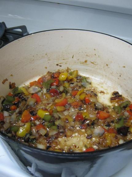 When the chicken is brown on all sides, remove it from the pan and add ¼ cup of olive oil to the same pot. Once the oil is hot (it will not take long), add the onions and peppers. Look at that colorful medley!