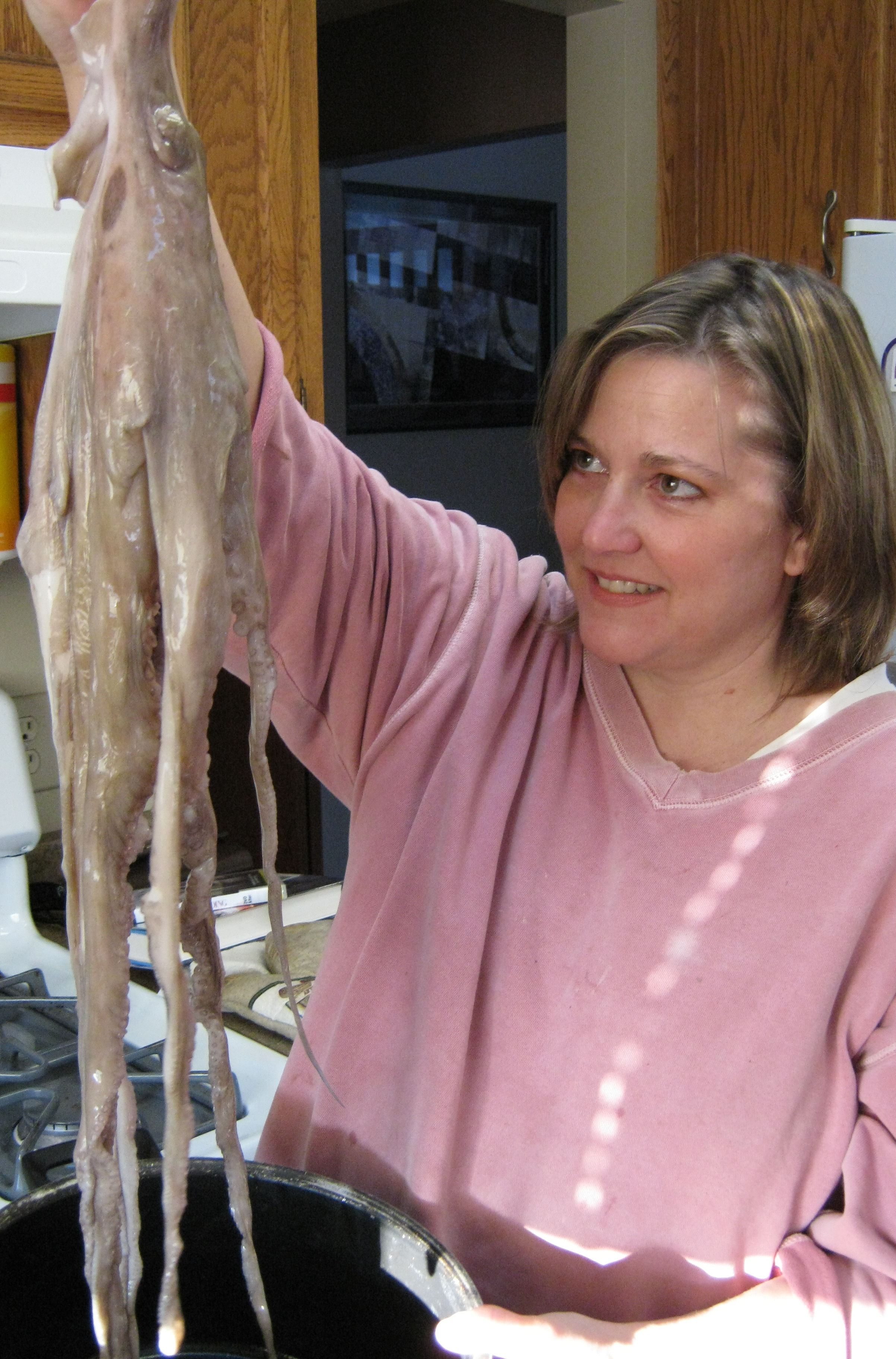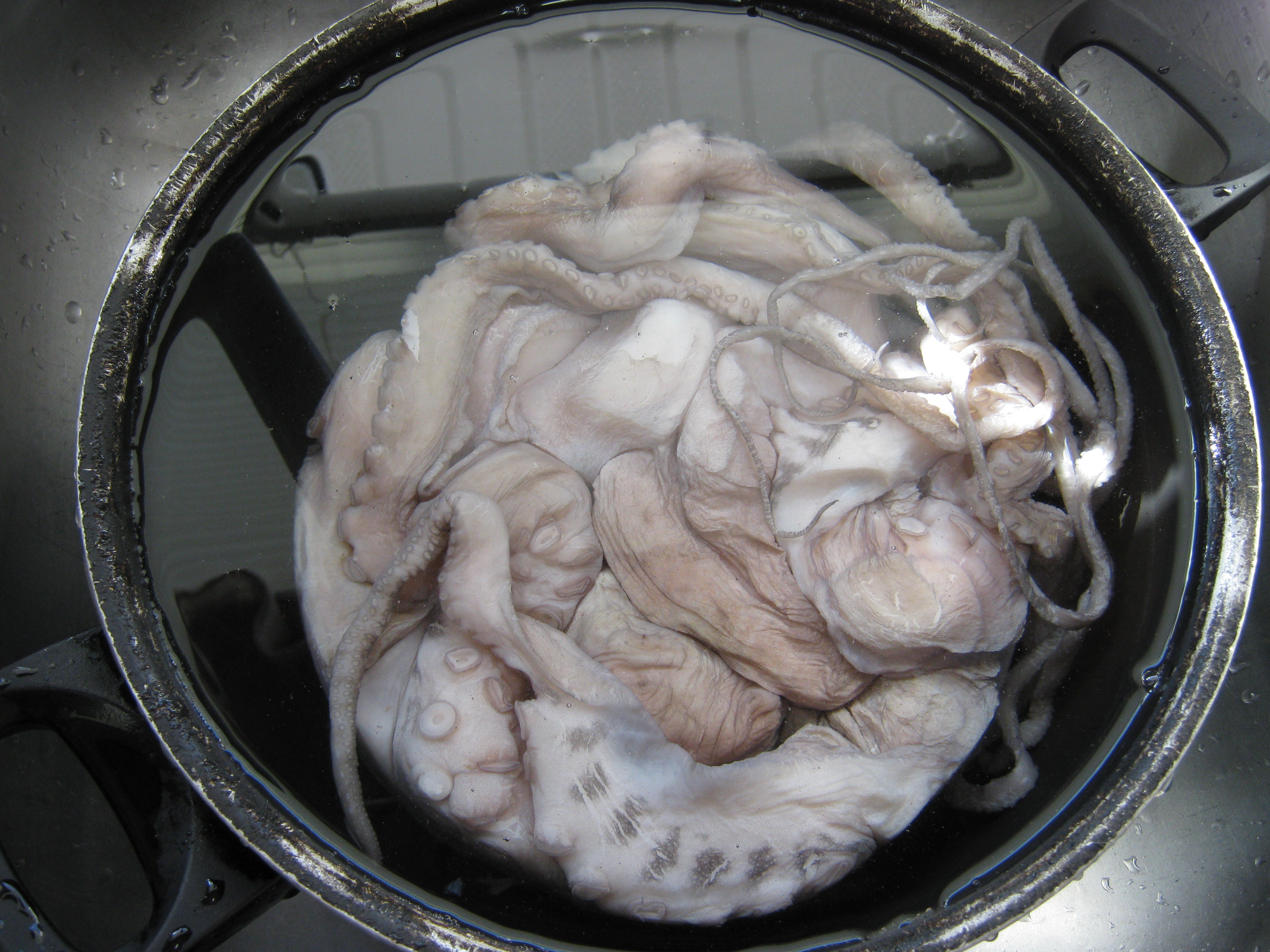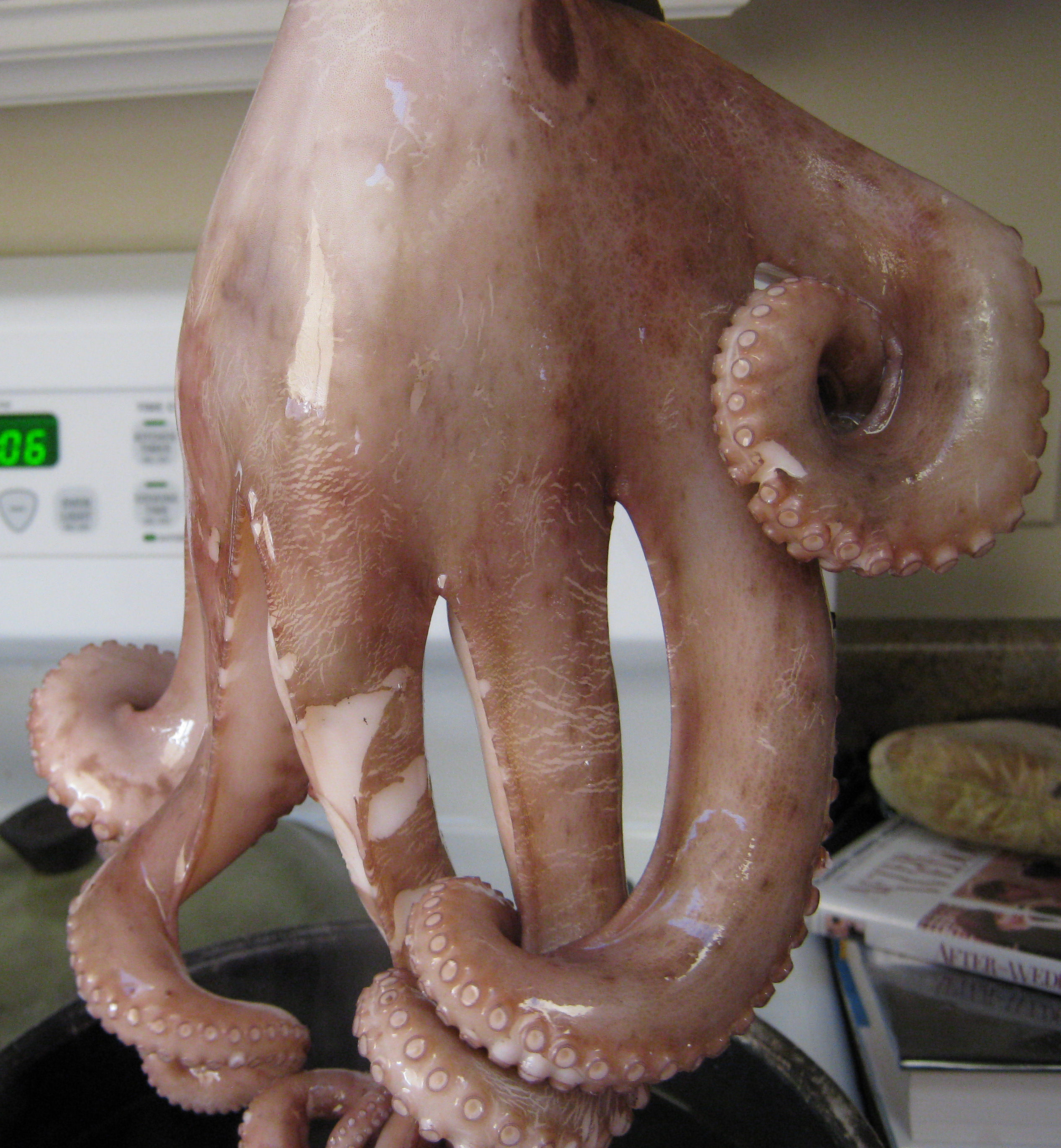 Step one of preparing an octopus for dinner is the Meet and Greet. This works best once the octopus is thawed.