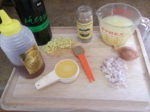 To make things go a little faster later, after measuring everything out, put all the liquids (except for the sherry) together in one cup, and all the “solids” in another. You’ll get a head start on cleanup as well.