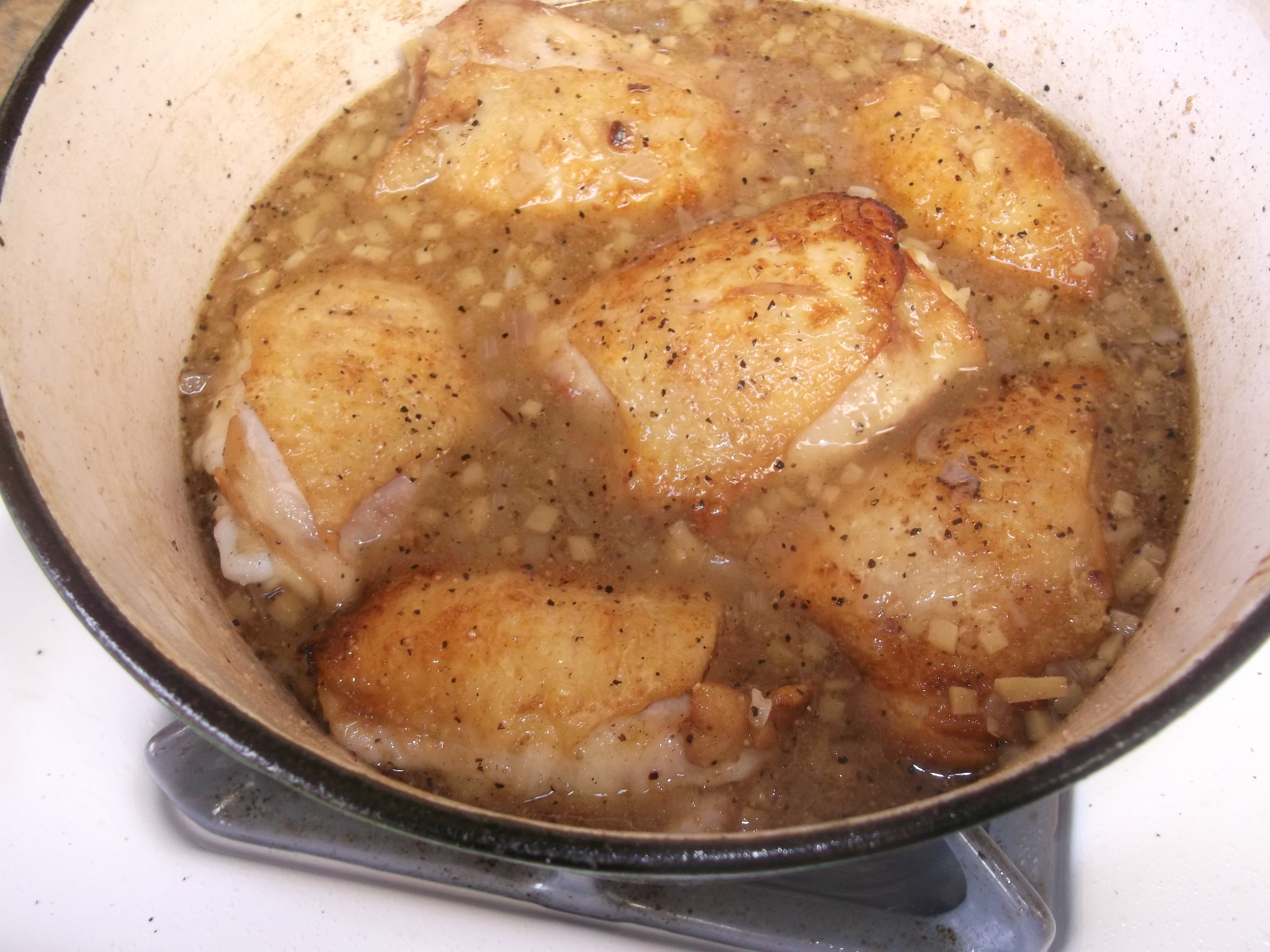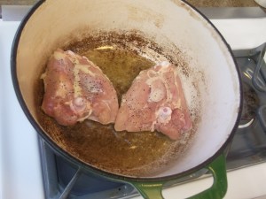 Heat the oil until shimmering, then add the chicken, skin side down first, and brown it in batches. Don’t overcrowd your pot – just put in as many comfortably fit. Think Business Class, with adequate room to stretch and move, not cramped like Coach.
