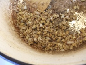 When all the chicken has been browned and removed, reduce the heat to medium and remove all but about 2 tablespoons of fat from the pot. Add the “solids:” the shallots, ginger, and cardamom. Sauté until the shallots soften, about 2 minutes.