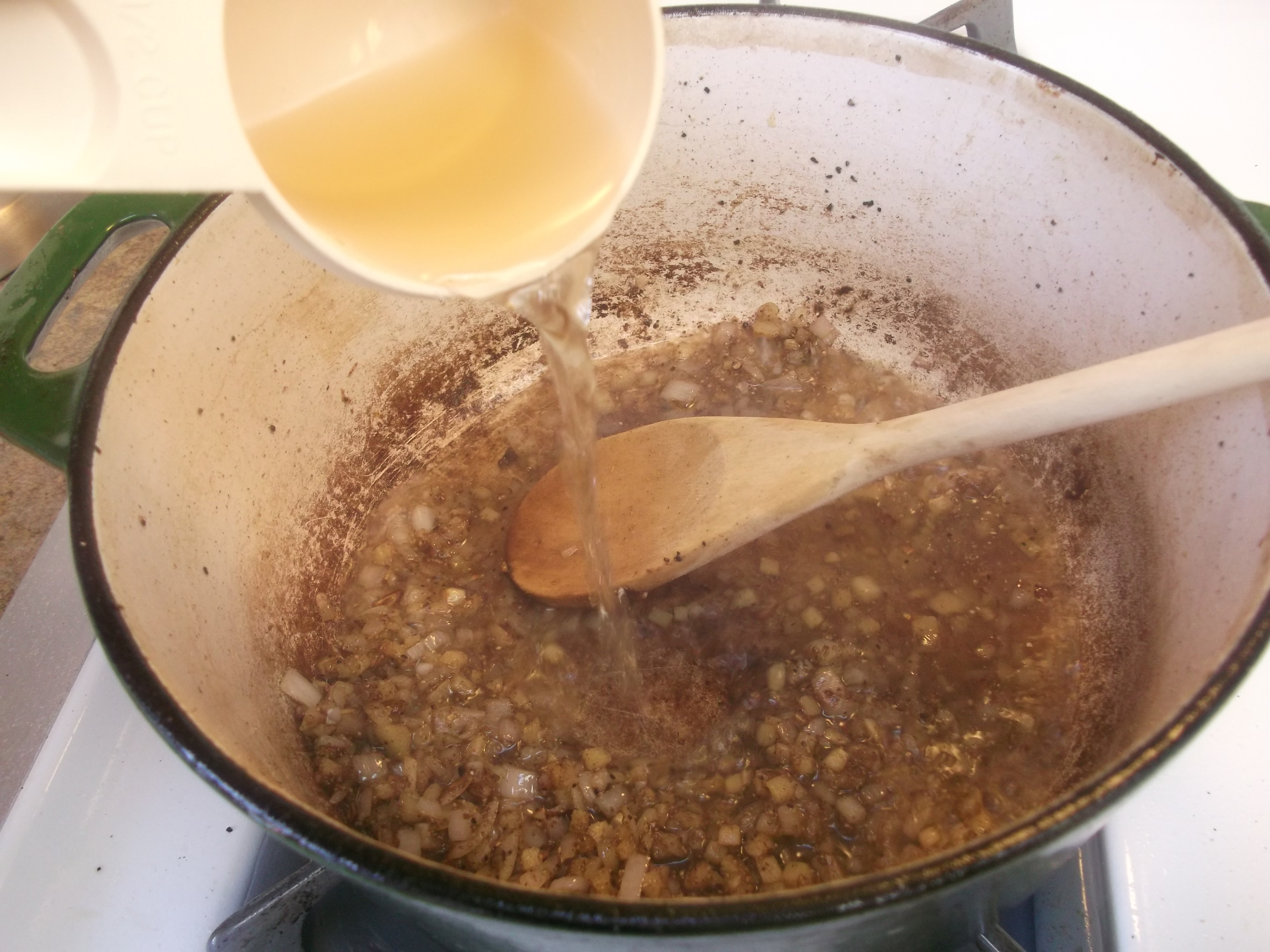 Pour in the sherry, scraping the bottom of the pot to release any browned bits, and reduce the liquid by half, about 3 to 4 minutes.