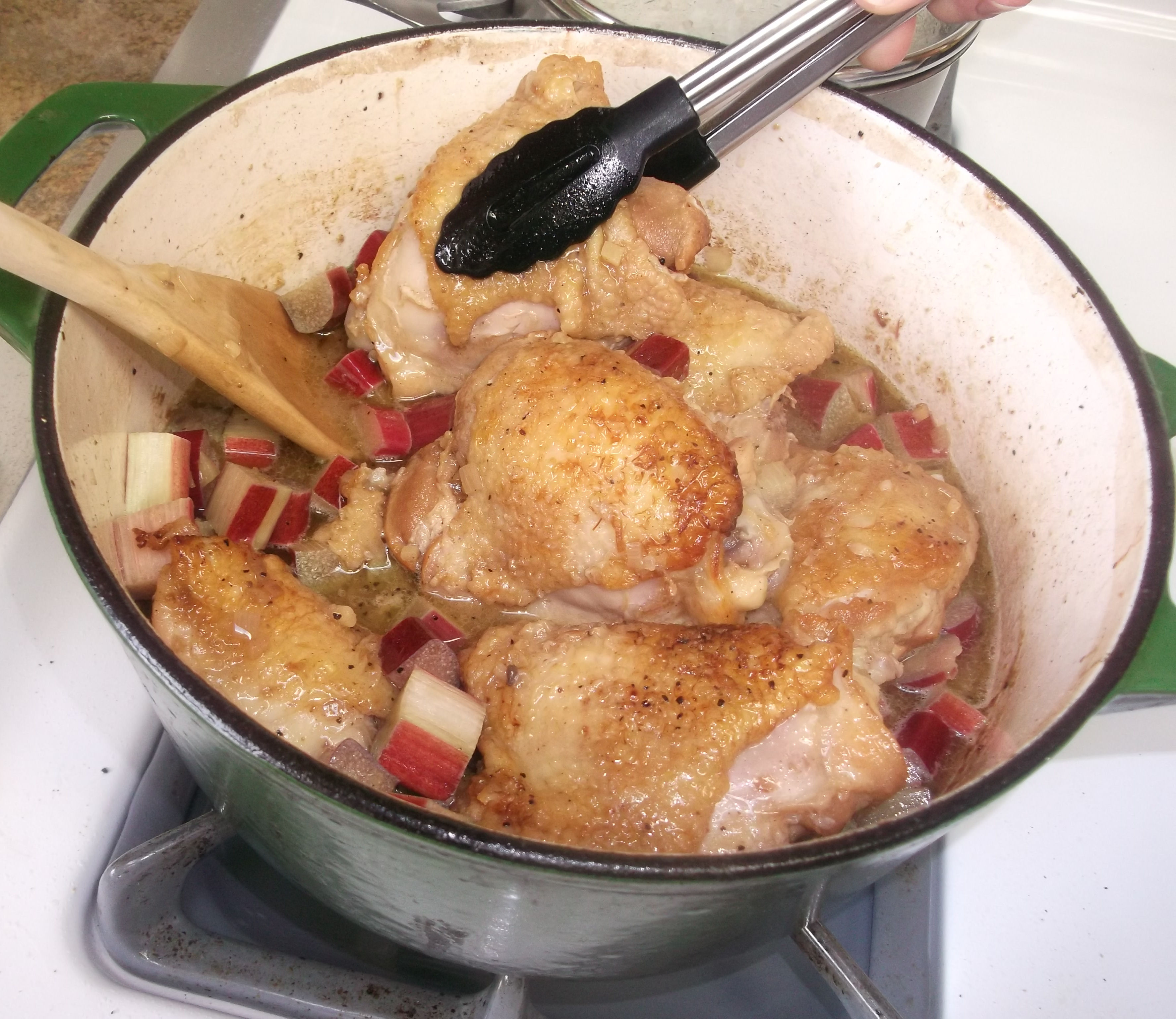 Add the rhubarb to the pot and use tongs to pick up each piece of chicken (gently, it’s very tender now and may fall apart easily), and then use a wooden spoon to coax the rhubarb underneath and between the pieces of chicken. The rhubarb needs to simmer in the sauce, so really get it under the chicken.