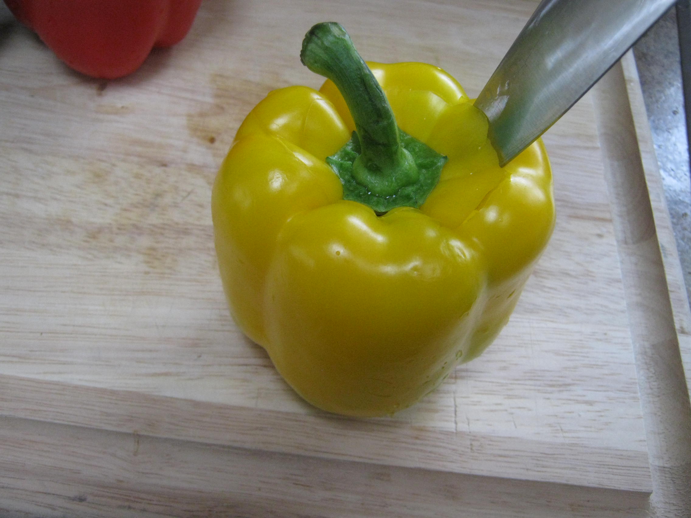 OLD WAY: I used to take the pepper, cut around the stem, then try to twist and pull it out carefully. However, this left me with a lot of ribs and seeds inside, plus it put my fingers in danger while trying to navigate a sharp knife in a circle.