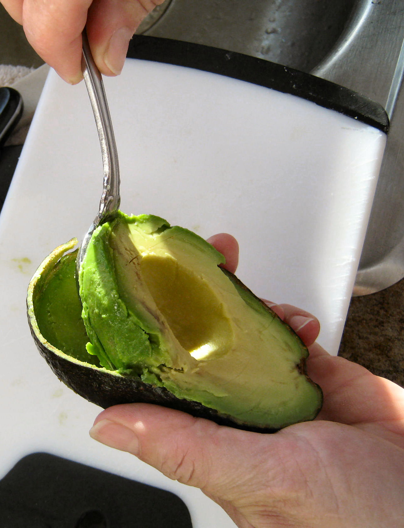 Gently insert a spoon into the back of the avocado and ease the green pulp away from the peel. The riper (softer) the avocado, the easier this will be. Just be careful not to puncture the avocado skin with the spoon.