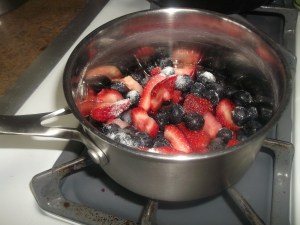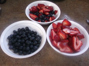 Start by slicing your strawberries so they are just a little larger than the blueberries. If using blackberries, cut those to the same size. You can use fresh or frozen fruit, or a combination of the two. There are really no hard and fast rules to this dessert. (I just used what I had on hand for this batch.)