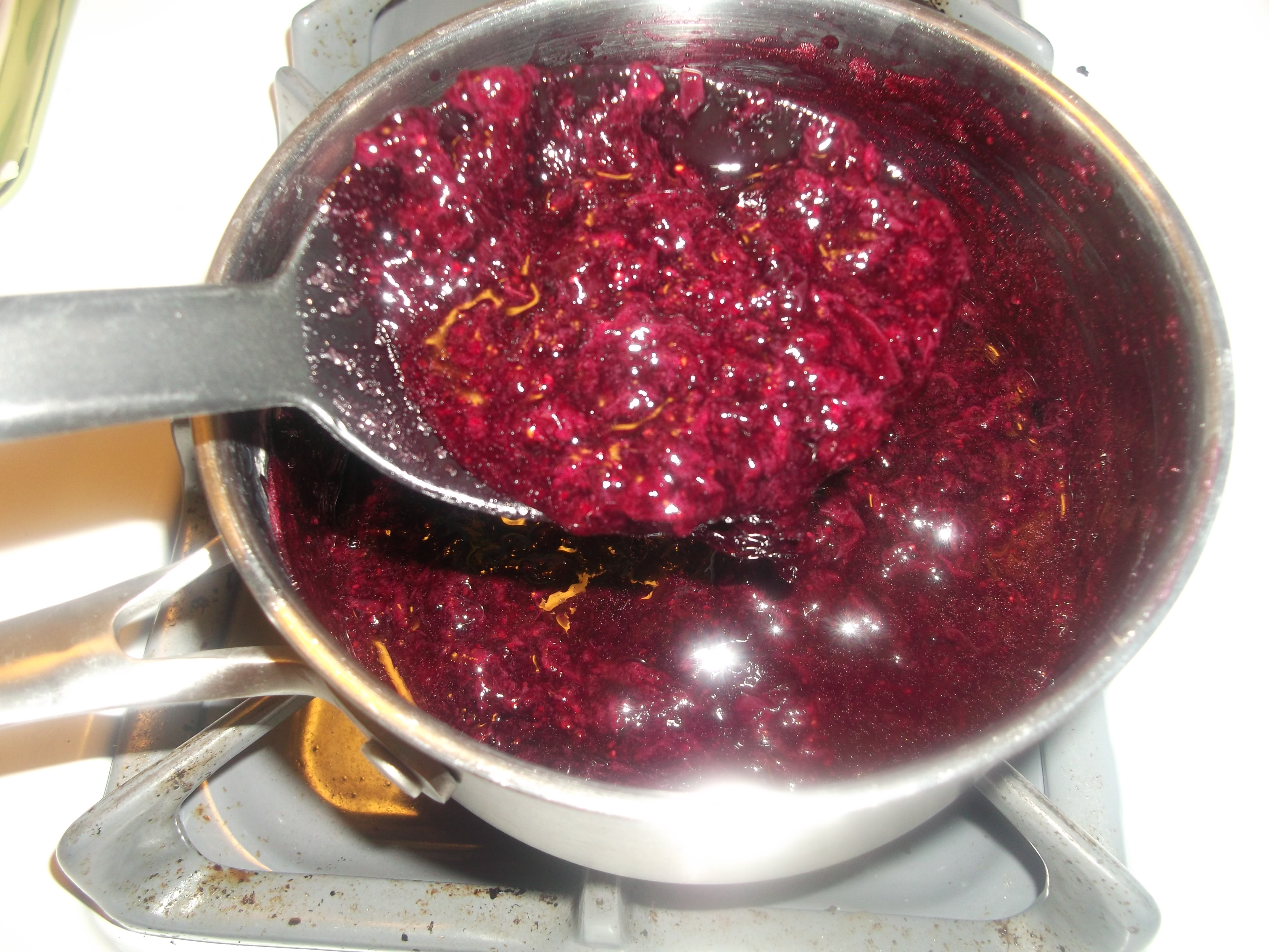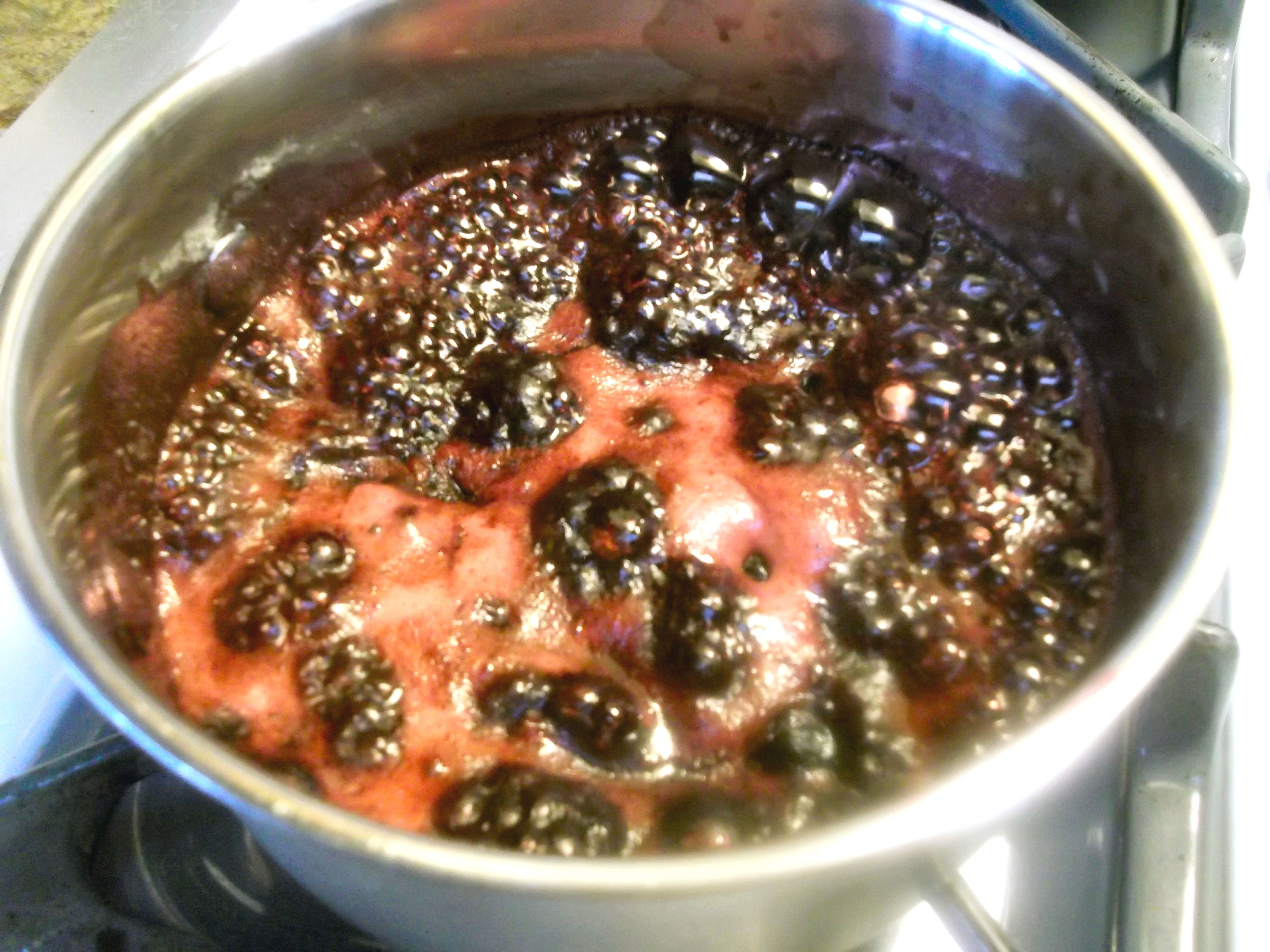 Bring to a simmer and cook until it gets a little foamy and when most of the berries have softened and mash easily against the side of the pan.