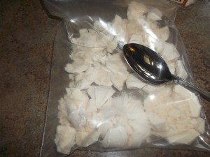 Take a few of the meringue cookies and place them in a plastic ziplock bag. Gently crush the cookies by squeezing the bag or tapping on the cookies with a spoon. (Or you can crush them with your hands.) Don’t pulverize them: you want them in chunks, not powder, and they should be about the same size as the solid fruit pieces. Repeat this step until you have about two cups’ worth of crushed cookies.