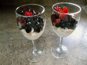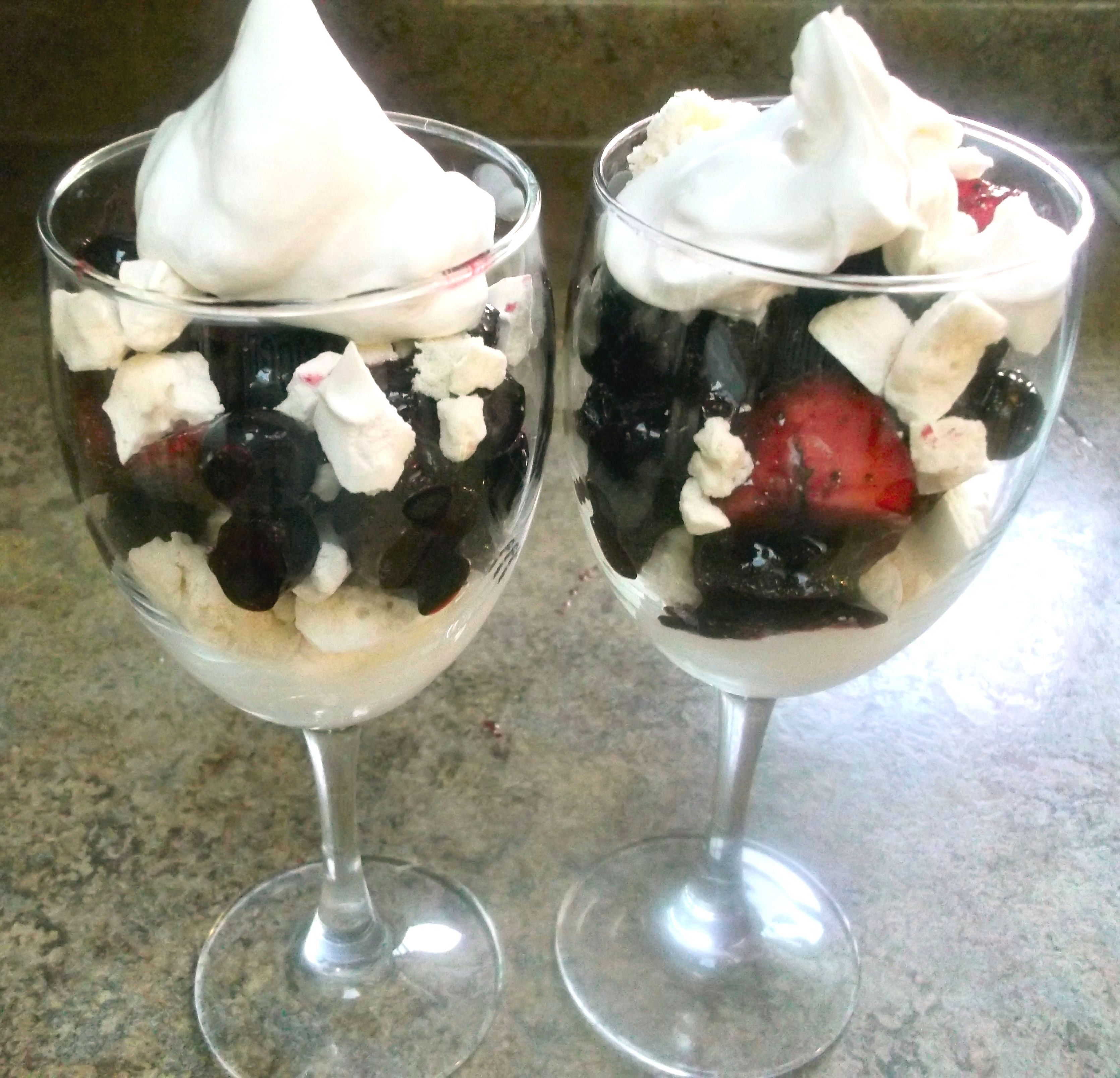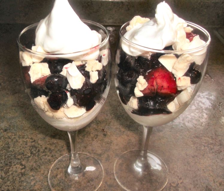To serve, assemble the desserts as follows: spoon a little whipped cream into the bottom of the dish/goblet, top with some of the crushed meringue cookies, and then add the berries.  Repeat, and top with whipped cream just before serving. (Can cover and refrigerate for several hours.)