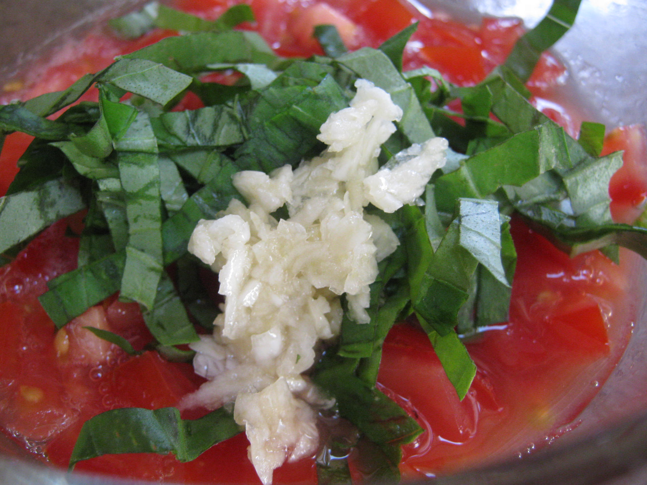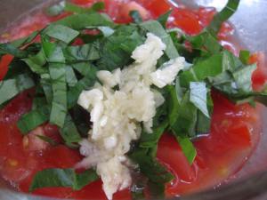 Take a round tomato and cut across its equator. Grate both halves on a cheese grater until just the skin remains. Discard the skin and place the grated tomatoes in a medium bowl (a glass bowl is best). Depending on the consistency desired, grate one or two more tomatoes. Slice each remaining tomato across the equator, then squeeze and discard the seeds and juice from each one. Dice them and add them to the bowl with the grated tomato. Add the minced garlic, basil, olive oil, and just a little salt and pepper. Mix well, cover and let sit at room temperature at least 30 minutes or up to 3-4 hours.