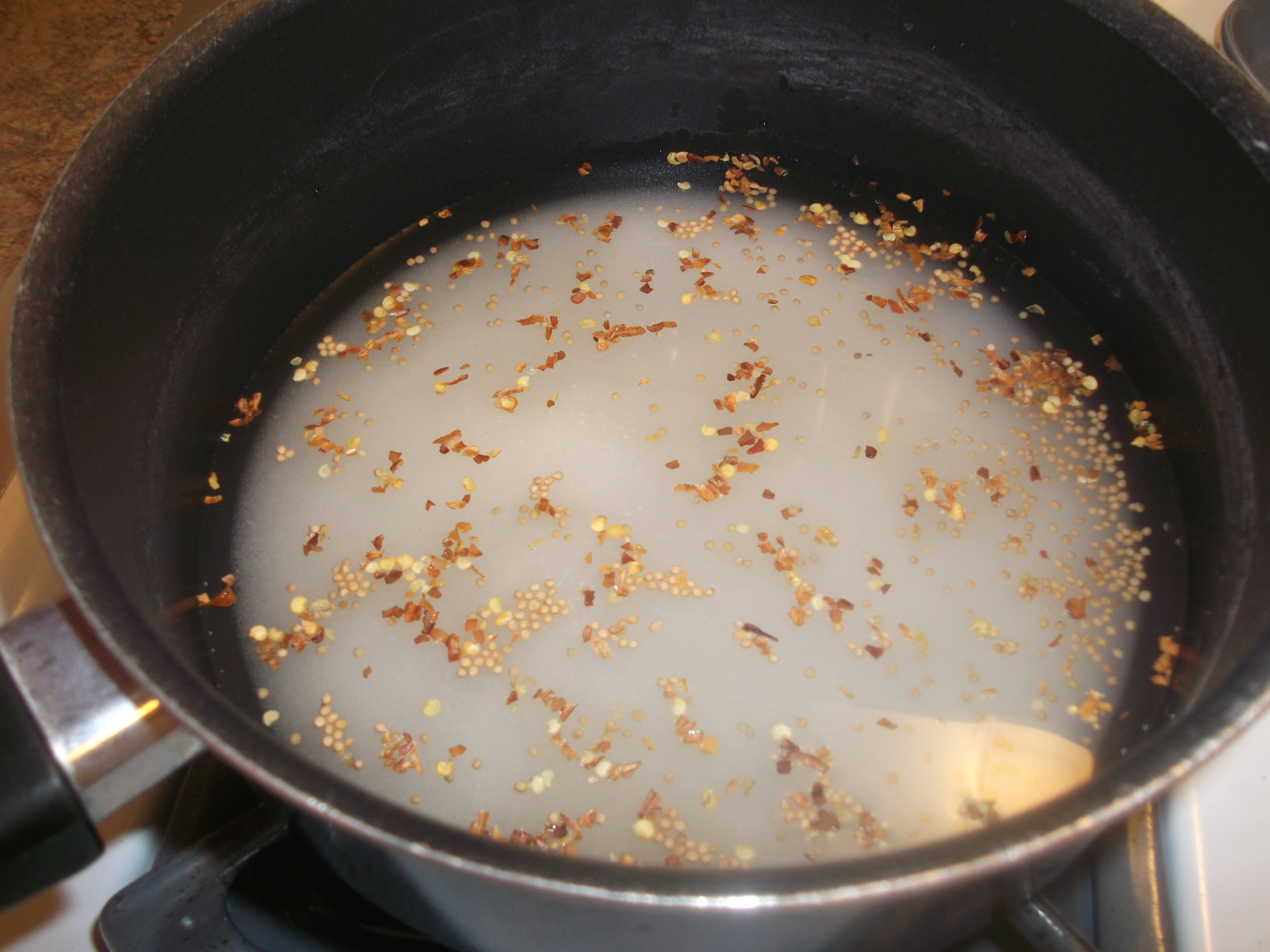 In a medium saucepan, combine the ingredients for the brine. If you like a little zing to your pickles, add more pepper flakes.