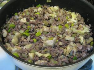 Start by browning the ground beef over medium-high heat.