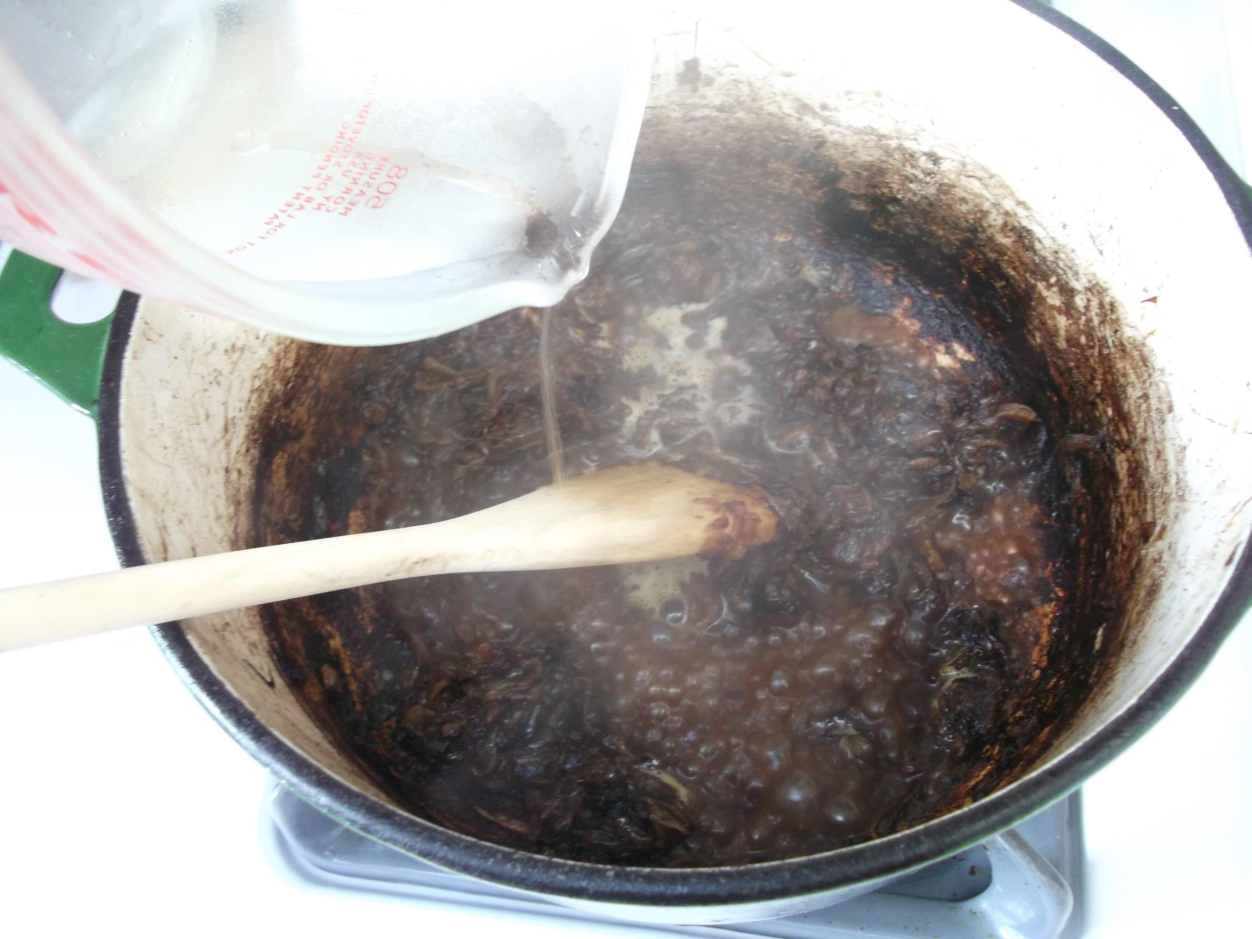 Deglaze the pan. Add ¼ C water to the hot pan of caramelized onions and scrape the bottom of the pan to loosen the crust. Cook until the water evaporates and more crust has formed, about 6 to 8 minutes. Repeat the process two to three more times, until the onions are very dark brown.