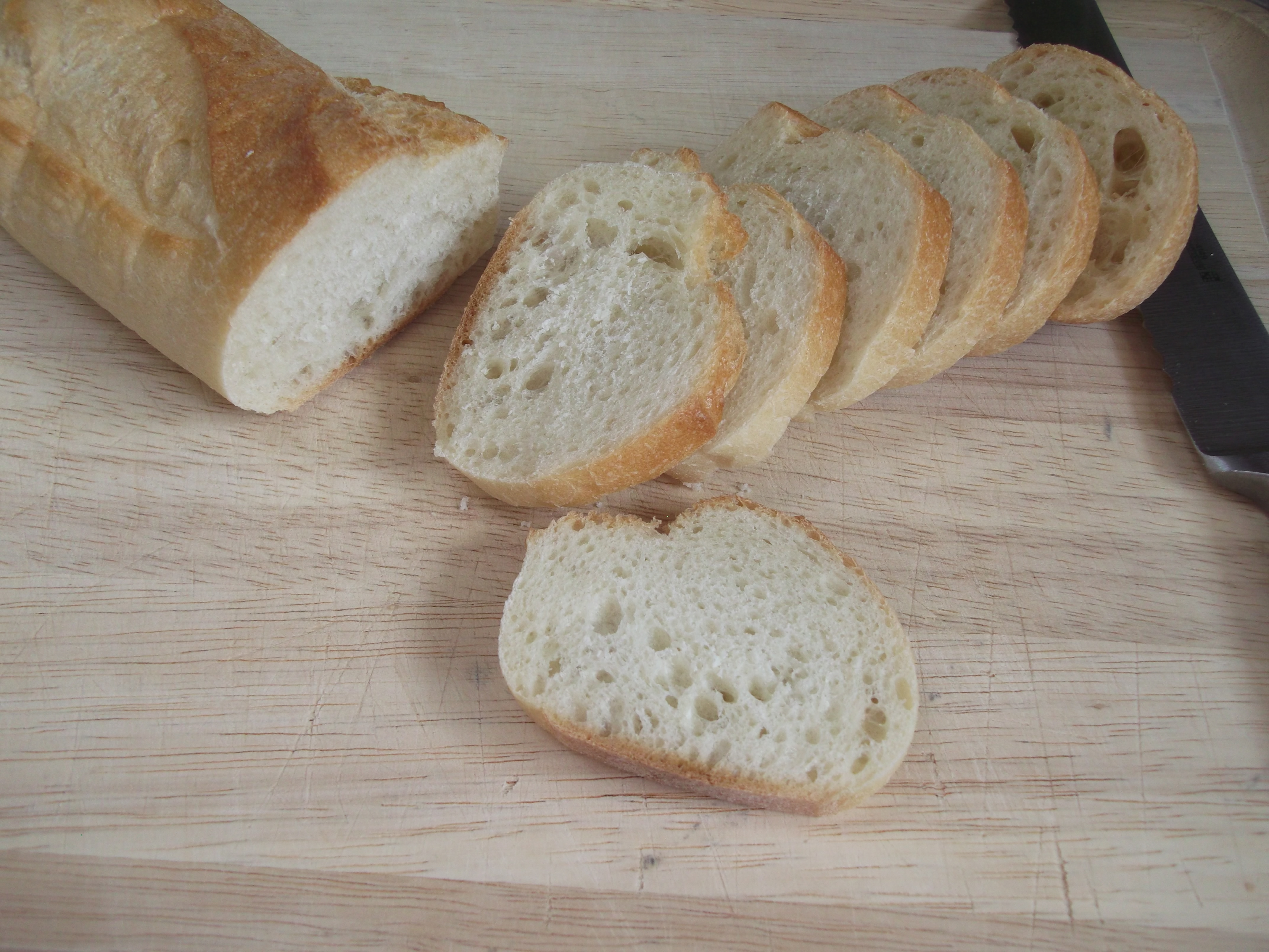 To make the croutons, slice a baguette into ¼” slices.