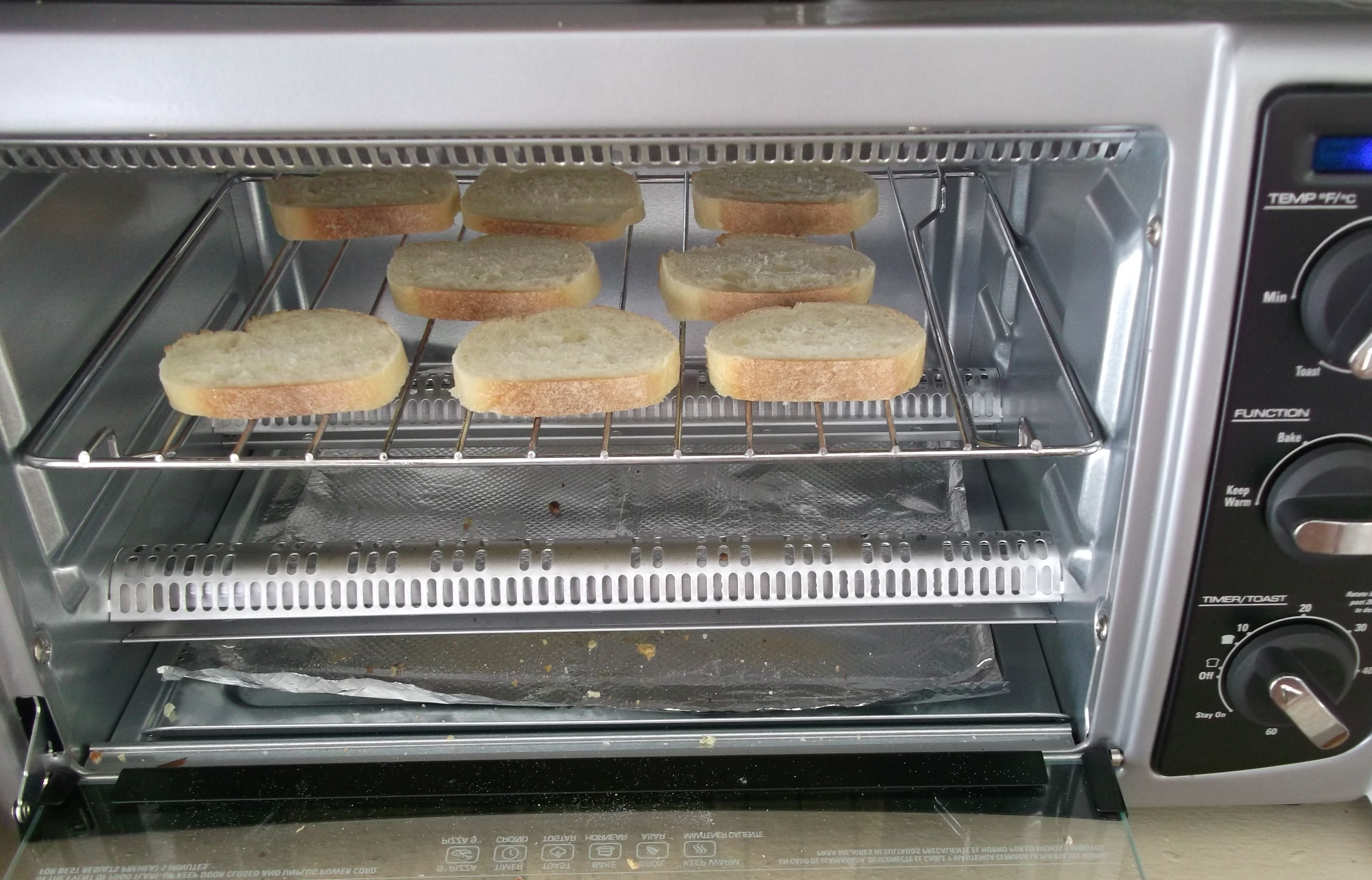 Alternatively, smaller batches of the bread can be toasted in a toaster oven until browned on both sides. Just watch them carefully. My first batch was black and smoking in no time.