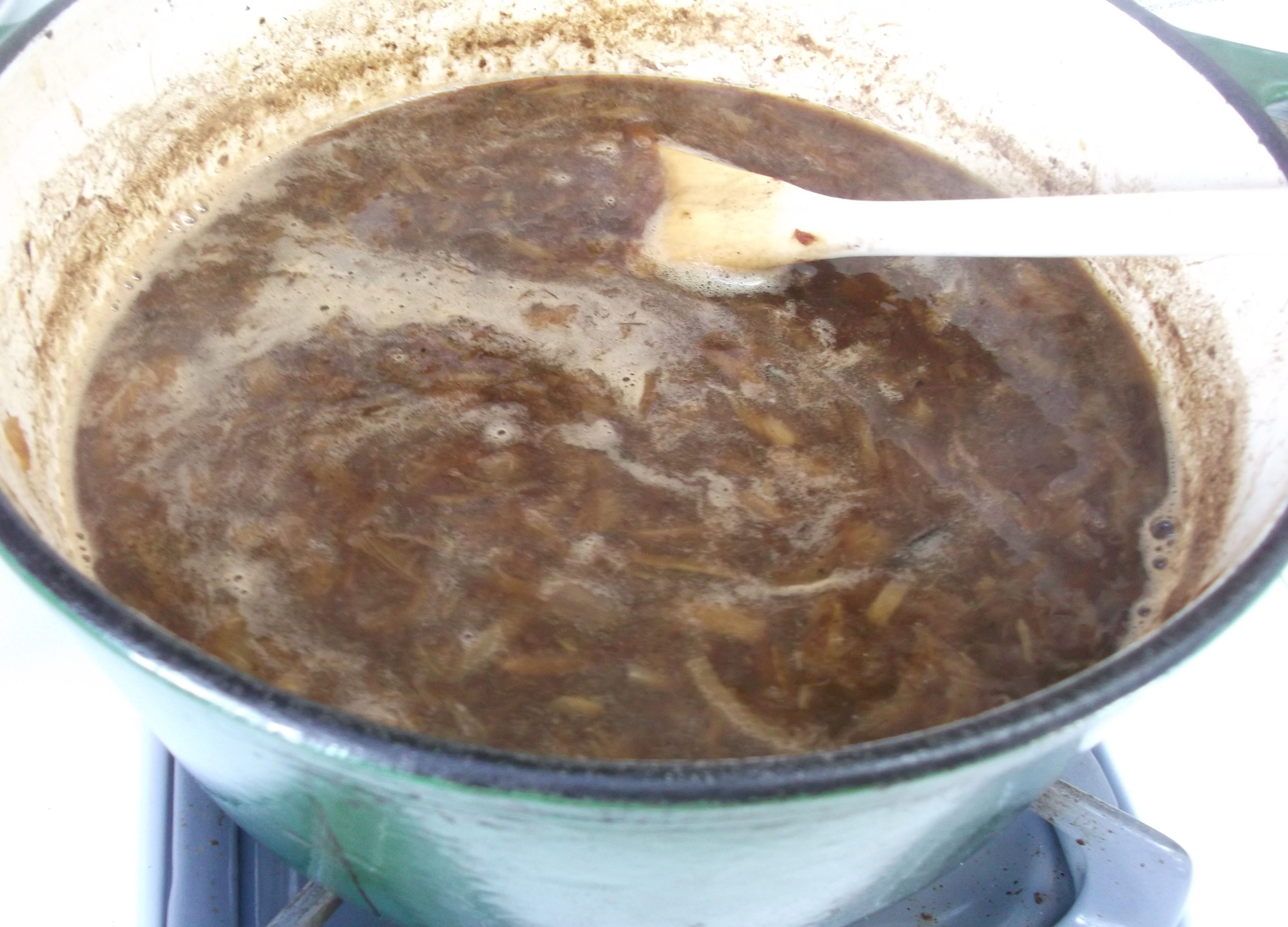 Caramelize the onions. Use either my easy oven method (takes longer but is mostly hands-free), or this traditional stovetop method (takes less time but is more involved): on the stovetop, in a 3 quart saucepan or larger, melt the butter and oil over medium-high heat. Add the onions, stir to coat, and cook, stirring occasionally, for about 30 minutes. Do not let the onions scorch. When they start to brown, reduce heat to medium-low and scrape the bottom of the pan with a wooden spoon. Scrape it hard, and scrape everything off the bottom. Continue to cook, stirring and really scraping every few minutes, until the onions are a deep brown, about 40 minutes more.