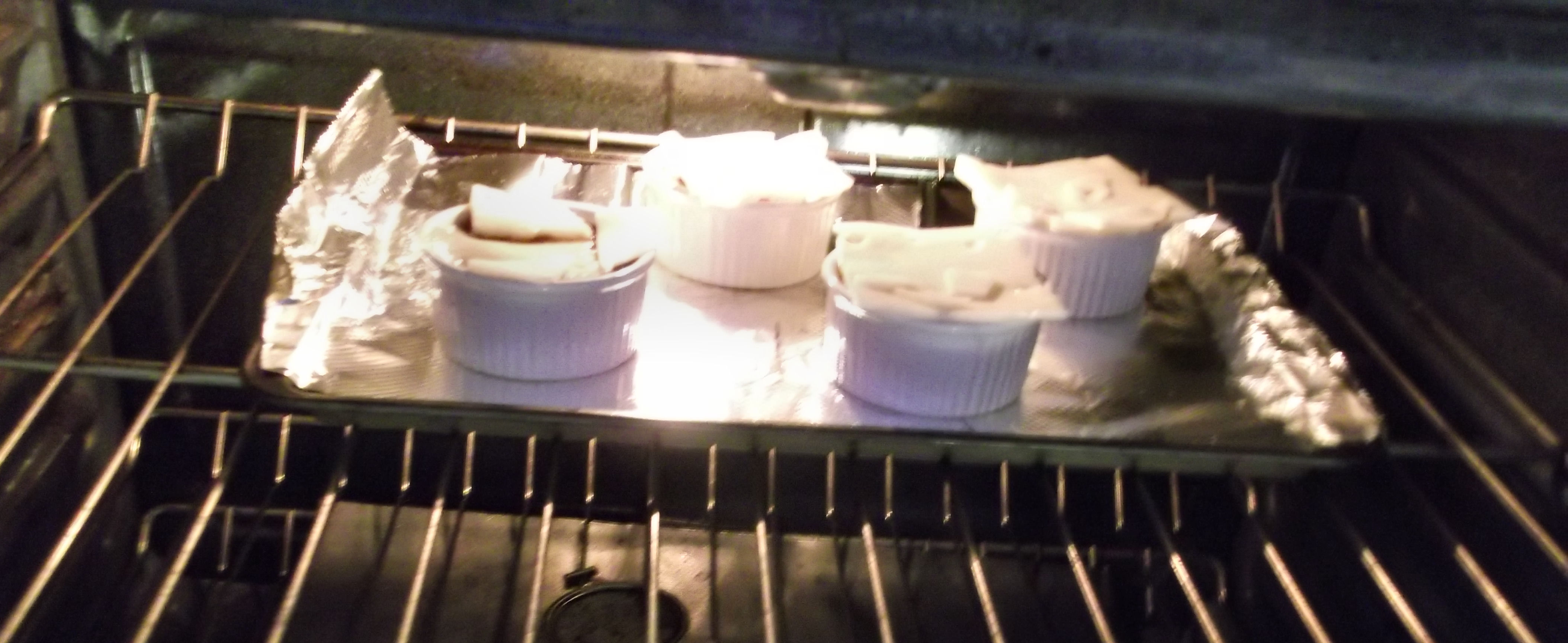 Set the crocks on a baking sheet lined with foil and fill each almost to the top. I can’t remember why I lined this with foil. Probably for easy cleanup of spills and melted cheese.
