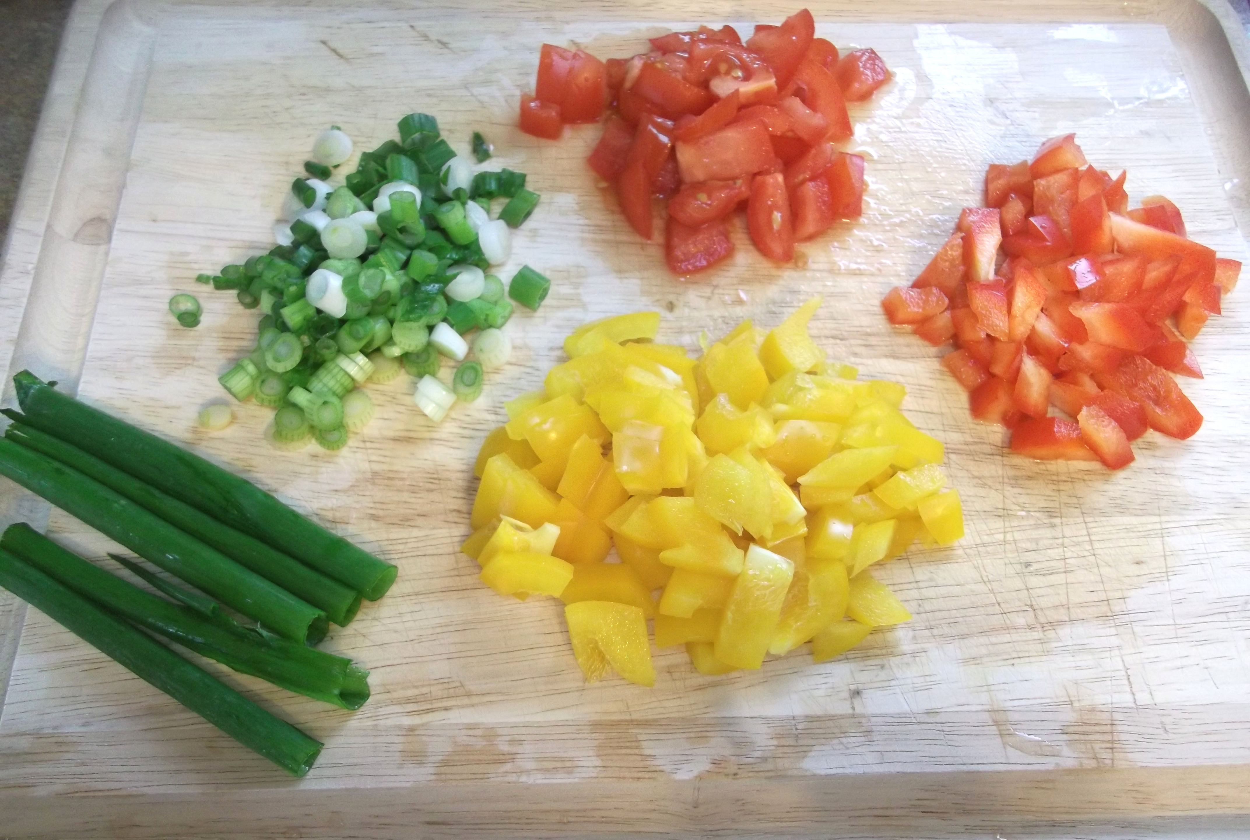 While the pasta cooks, chop the green onions (chop the green onion tops, too, and set them aside for later), bell peppers and tomatoes (if using). I only added the tomatoes because I had some around. Look at all that tasty color!