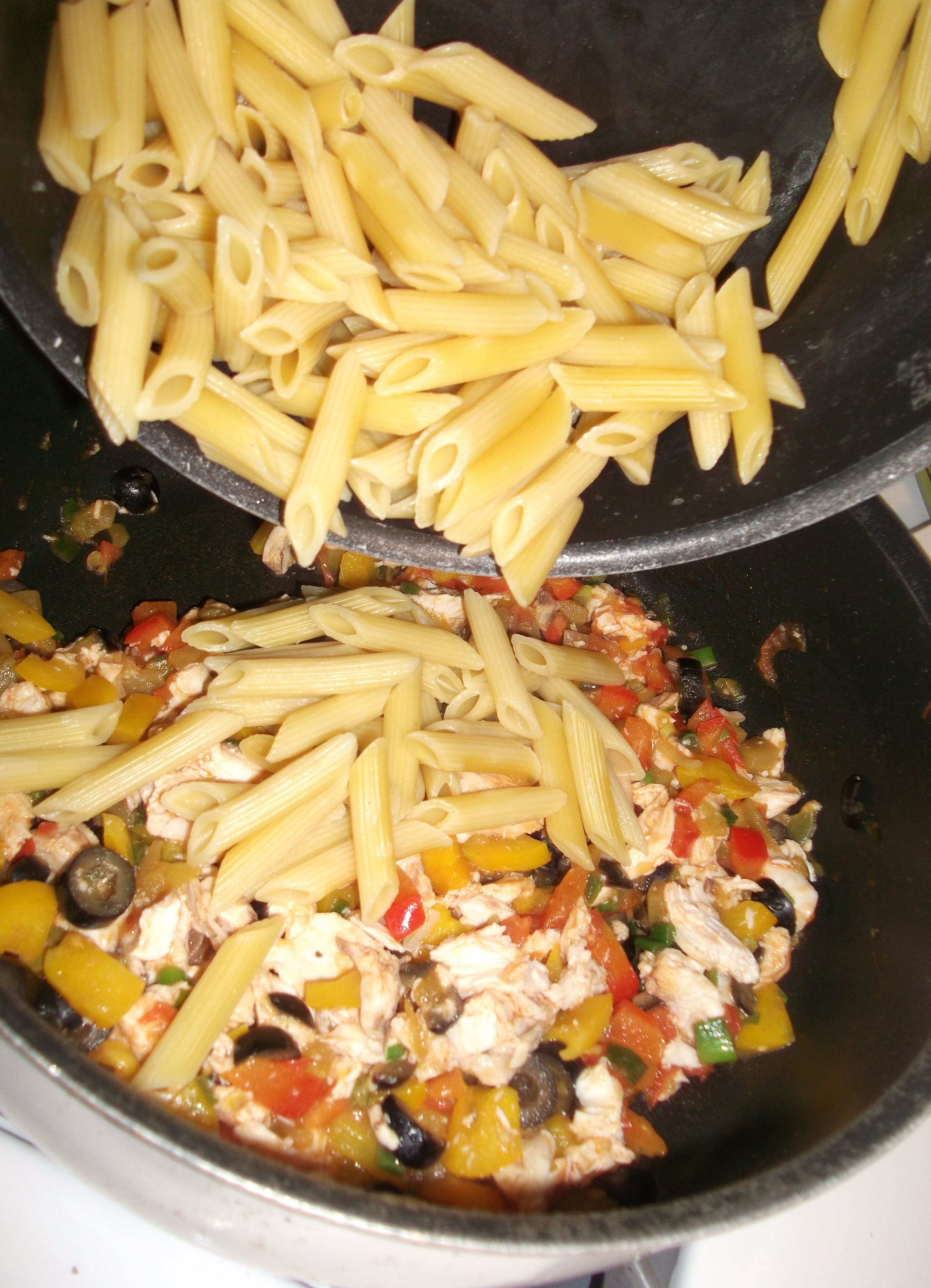 Add the chicken, stir to mix well, and then add the pasta.