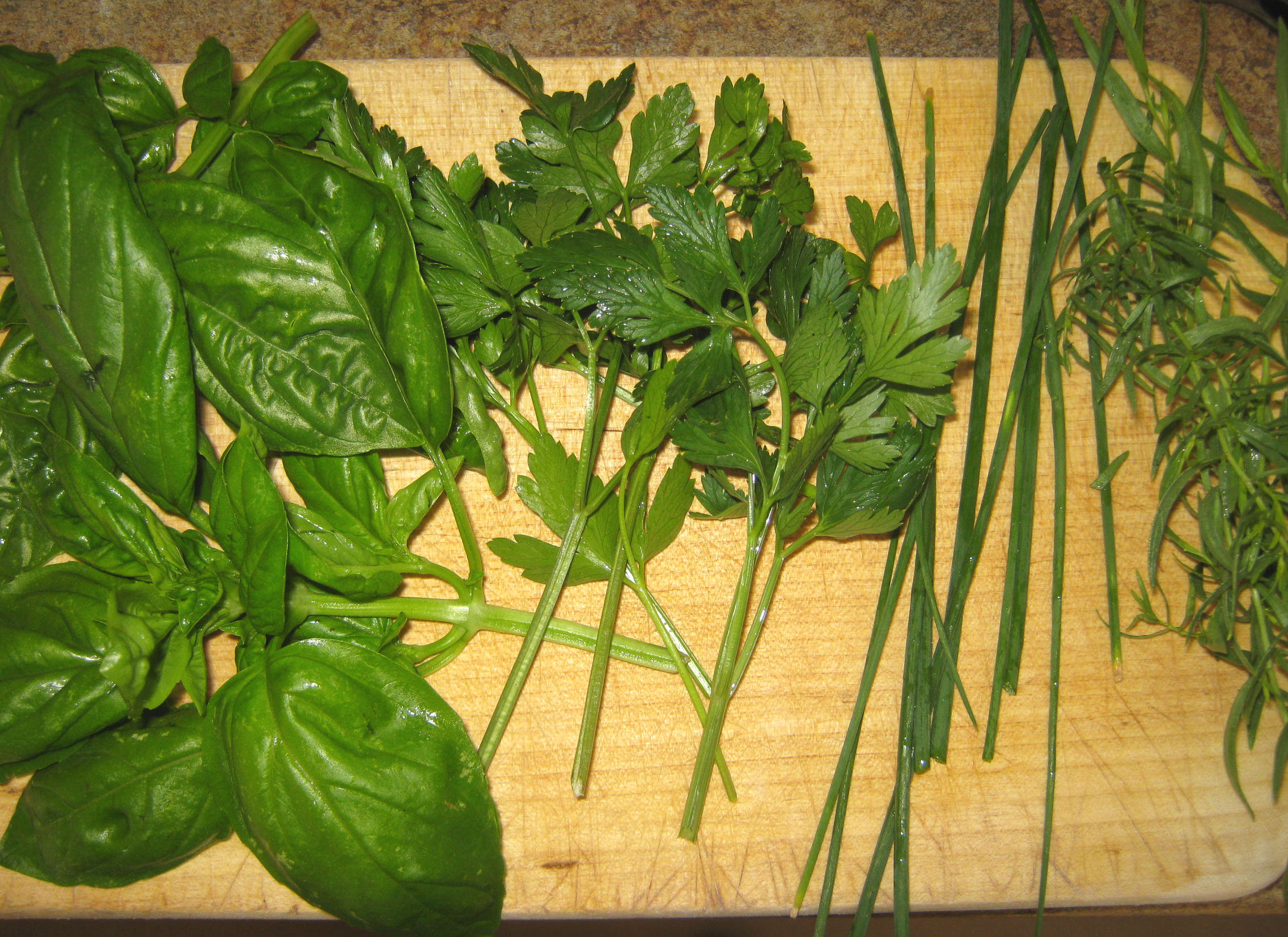Gather the fresh tarragon and any other summer herbs and chop them all up. I added basil, Thai basil, parsley and chives. Stay away from the stronger herbs, like thyme, oregano, or sage, as they may overpower the sweetness of the salad. (Then again, they might taste great!)