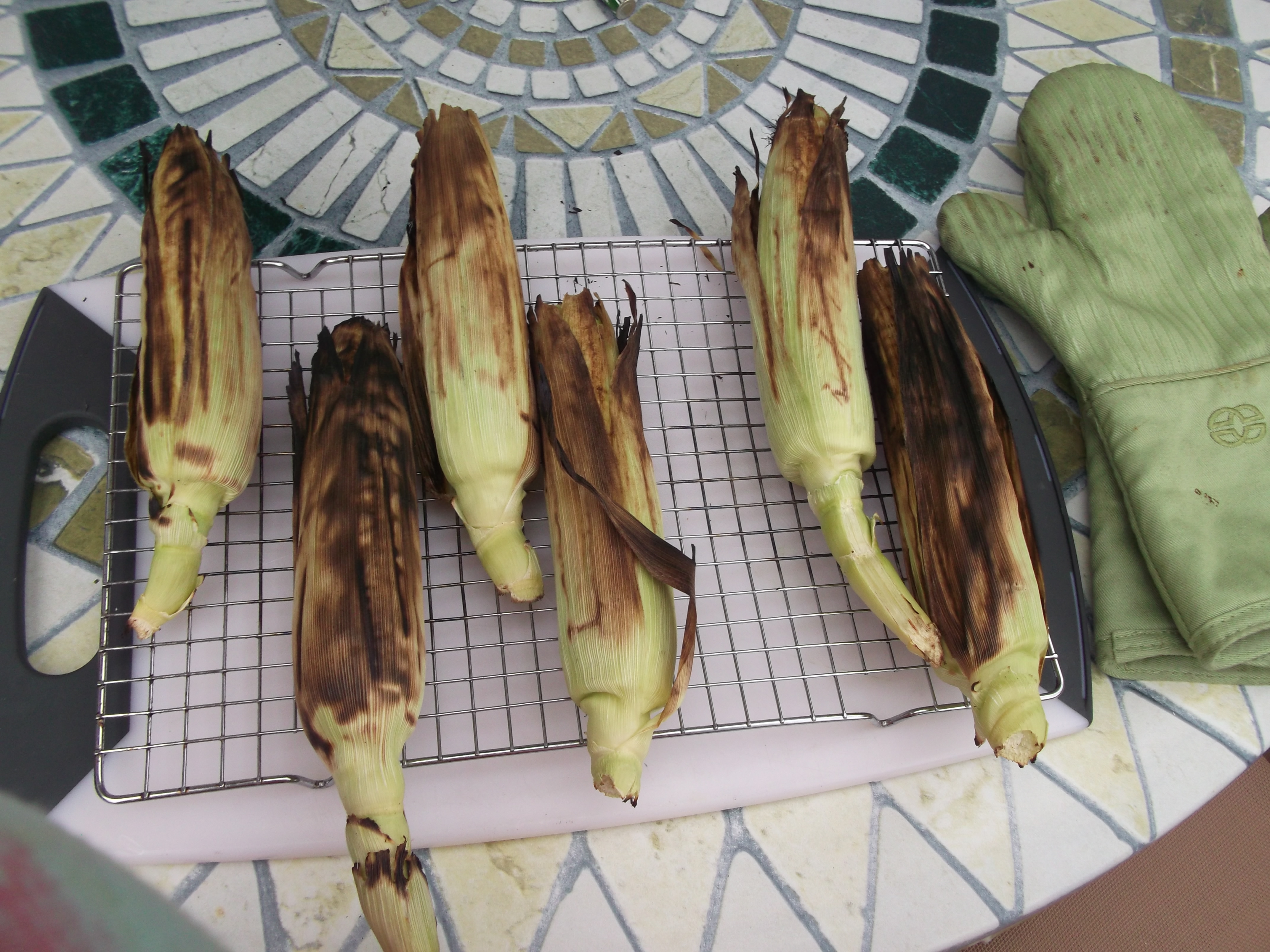 8) The final two minutes or so are for touch-up: if an ear is evenly browned/charred on all sides and parts of the ear, it can be removed. If there are still some lighter or green areas, place those over the heat to get a little more color.