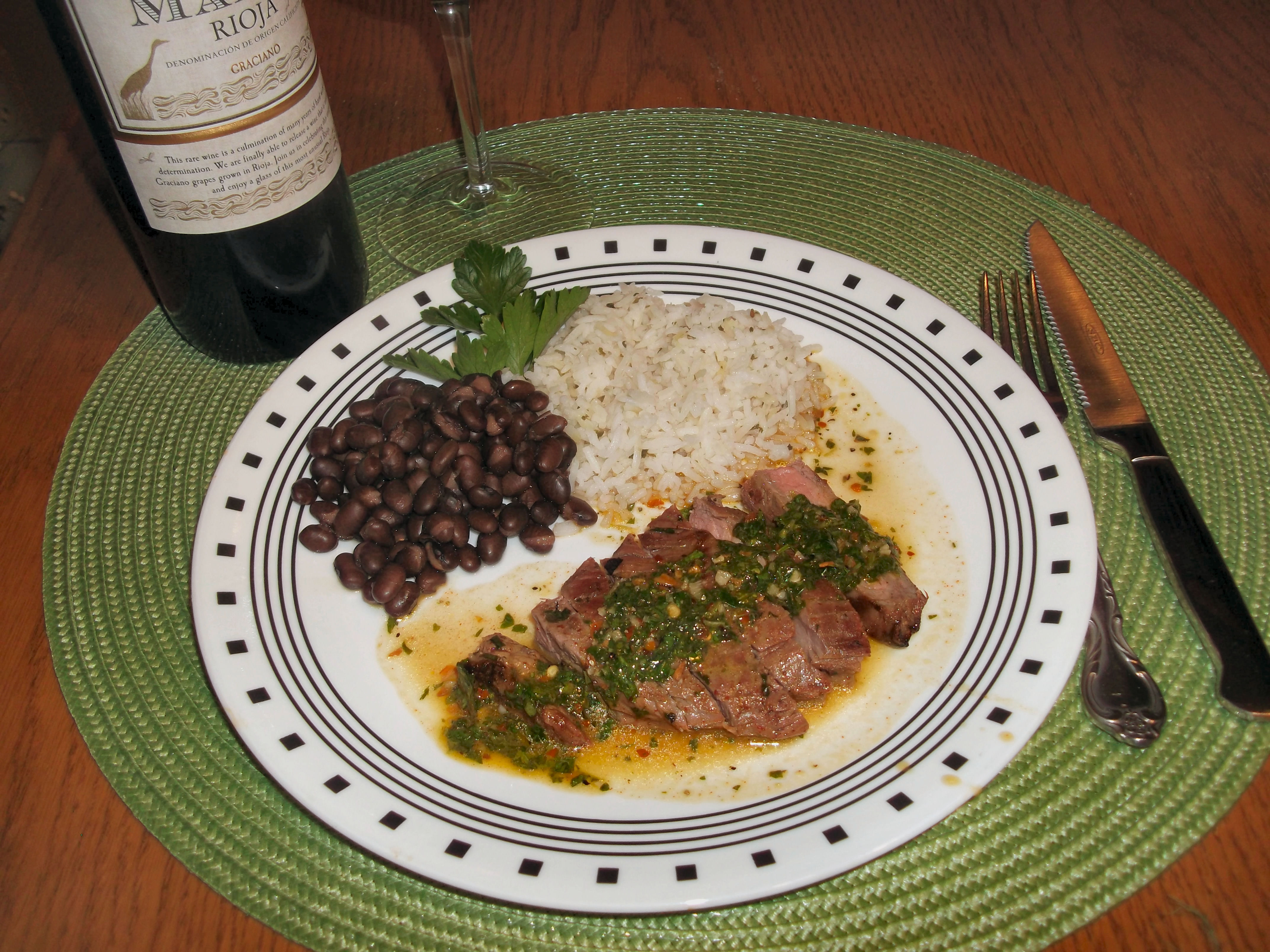 To serve, slice the steak thinly across the grain, top with chimichurri and serve with white rice and black beans.