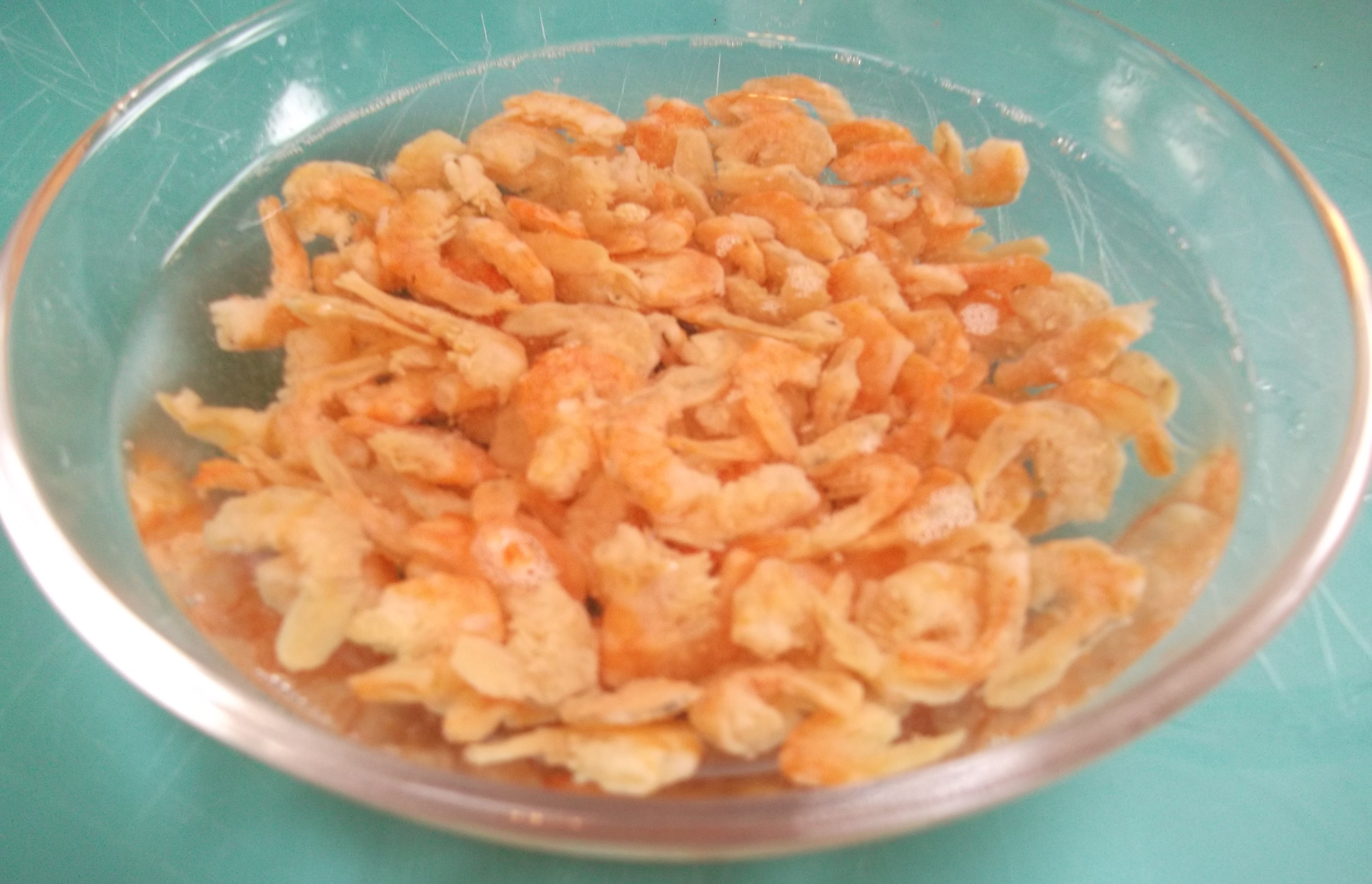 Place the dried shrimp in a bowl and cover with hot water to soften; set aside.