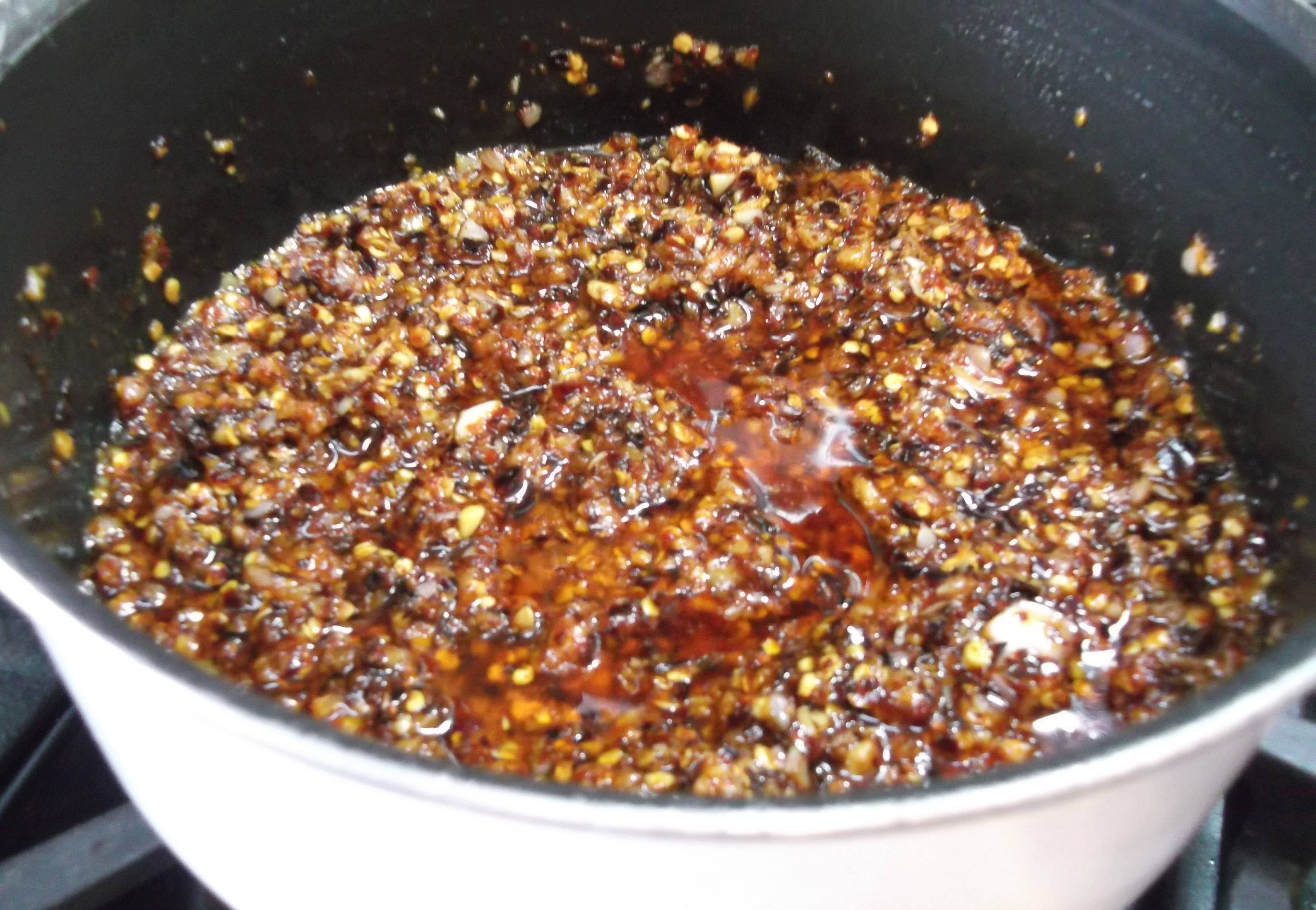 Once the mixture is fragrant and has turned a dark red/brown color, remove the pan from the heat and stir in enough of the remaining oil to reach the desired consistency.