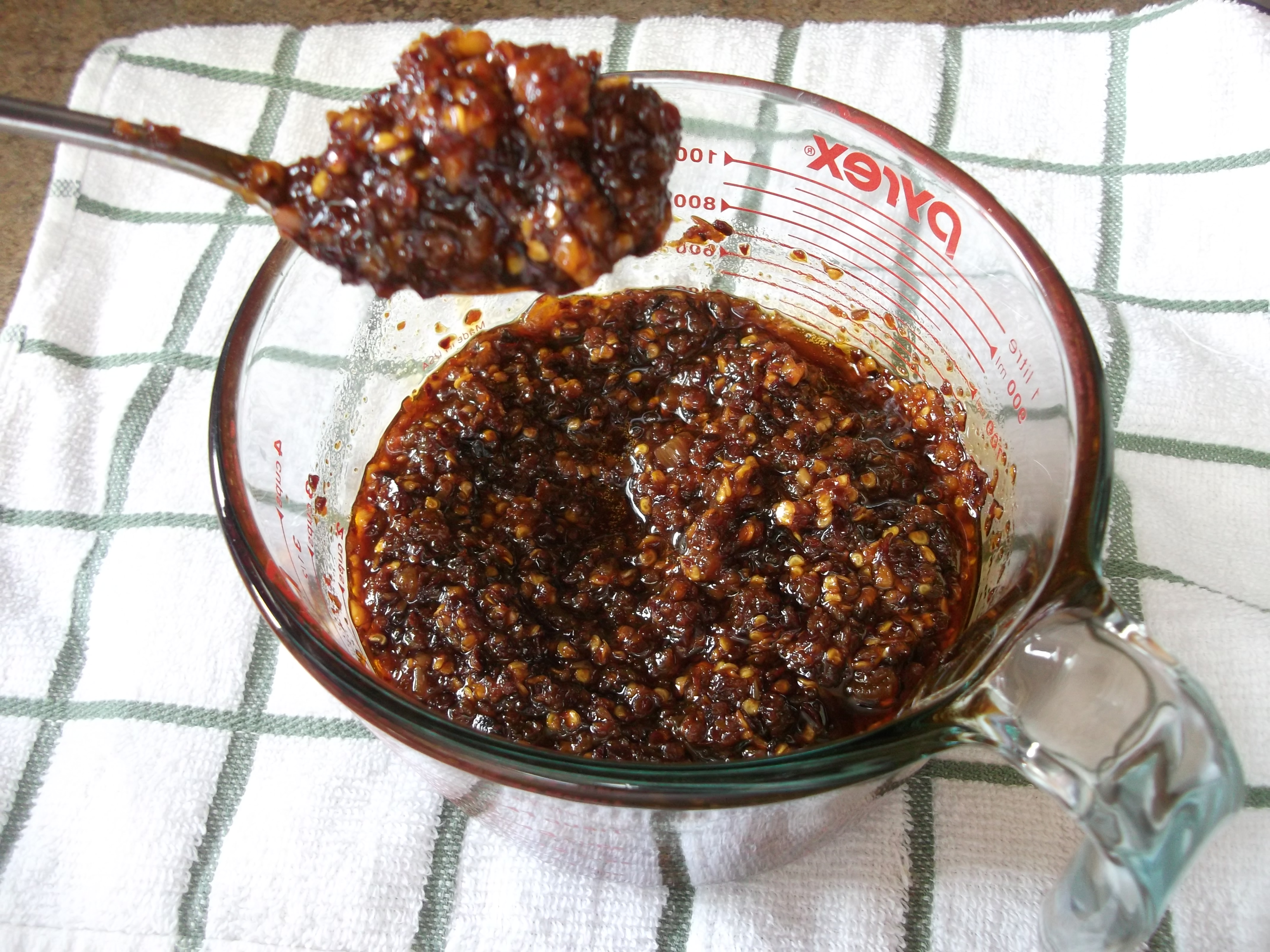 When the mixture is fragrant and has turned darker red/brown, remove the pan from the heat. Stir in remaining oil to reach the desired consistency and flavor. Allow to cool, then spoon into clean bottles or jars. The oil will last several months in the refrigerator.