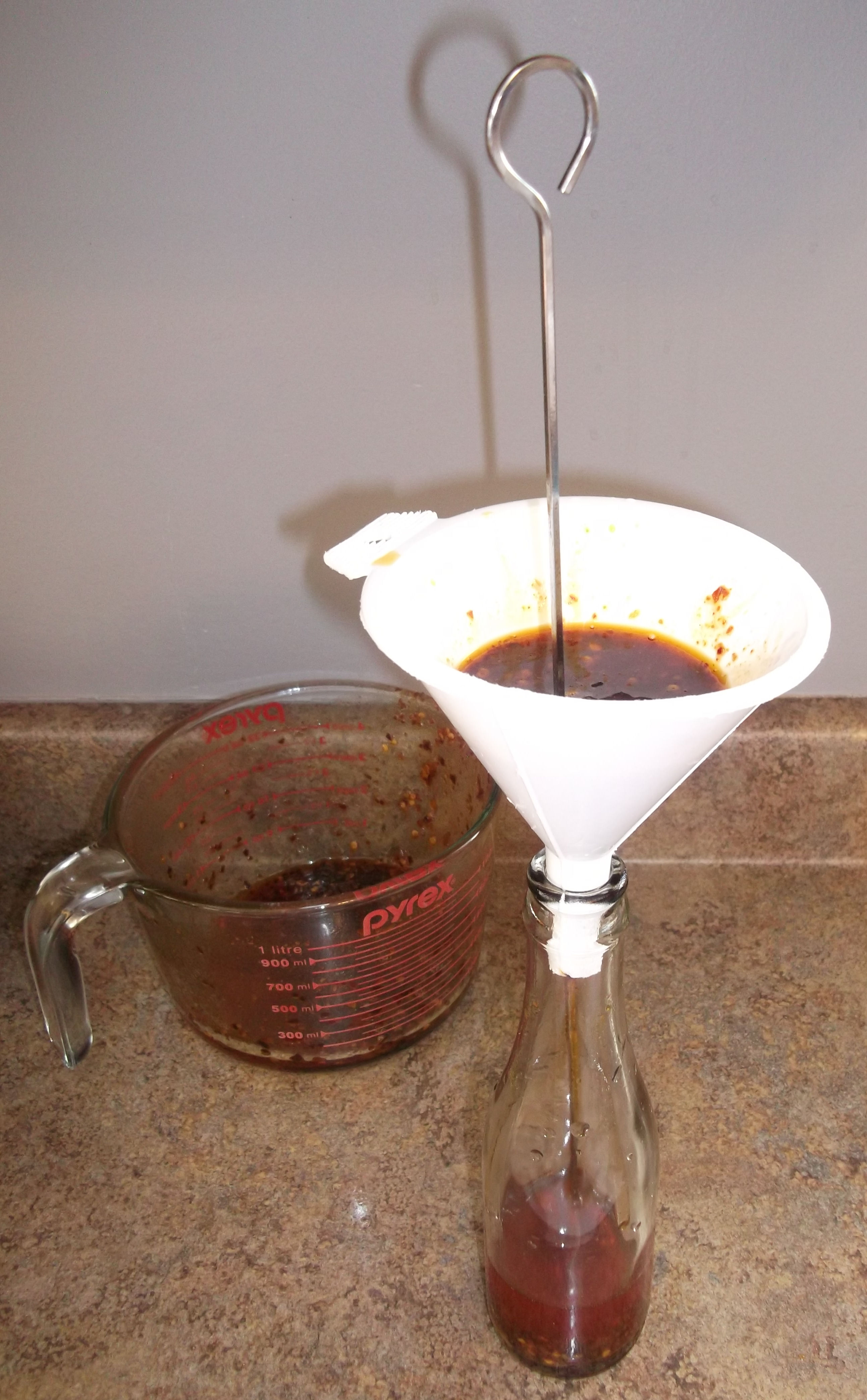 Note: if putting this into a bottle, use a funnel with a skewer to stir/poke the solids down. It will take a little time and effort: it’s pokey (pun fully intended), but it will eventually fill up.