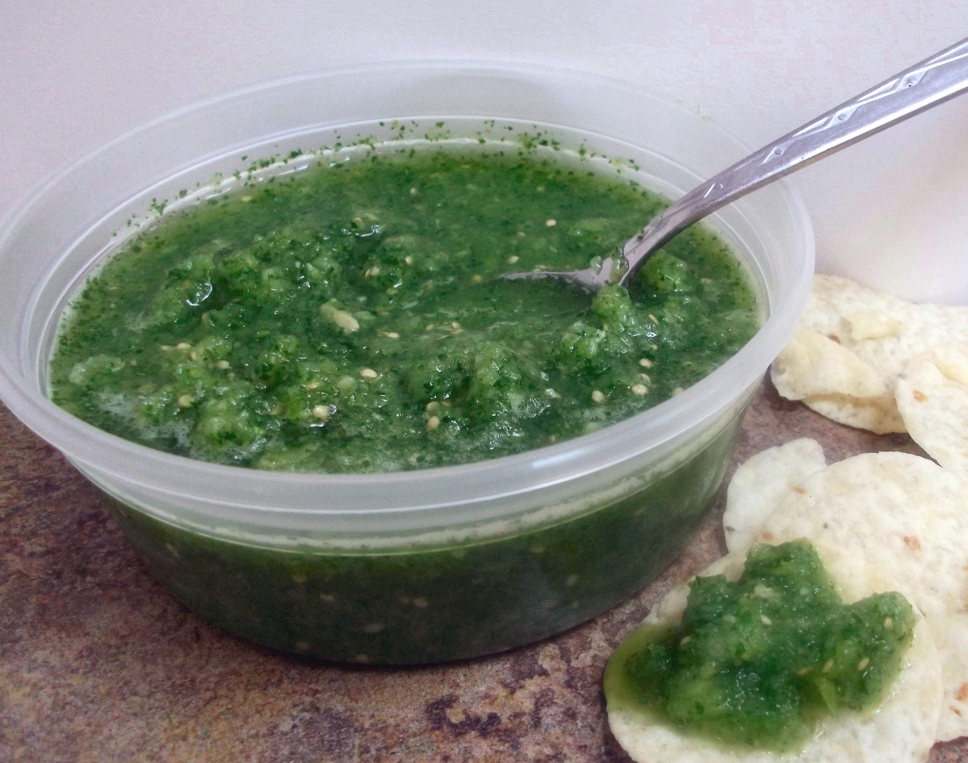 My dad helped me come up with ideas on how to make this salsa best in class as well as unique, which is how the fresh horseradish found its way to the ingredient list. The other ingredients are pretty standard and all meet the requirement of being green. Give this salsa a try, and just see how long it lasts. Make sure you have a full bag of chips on hand. You’ll need them.