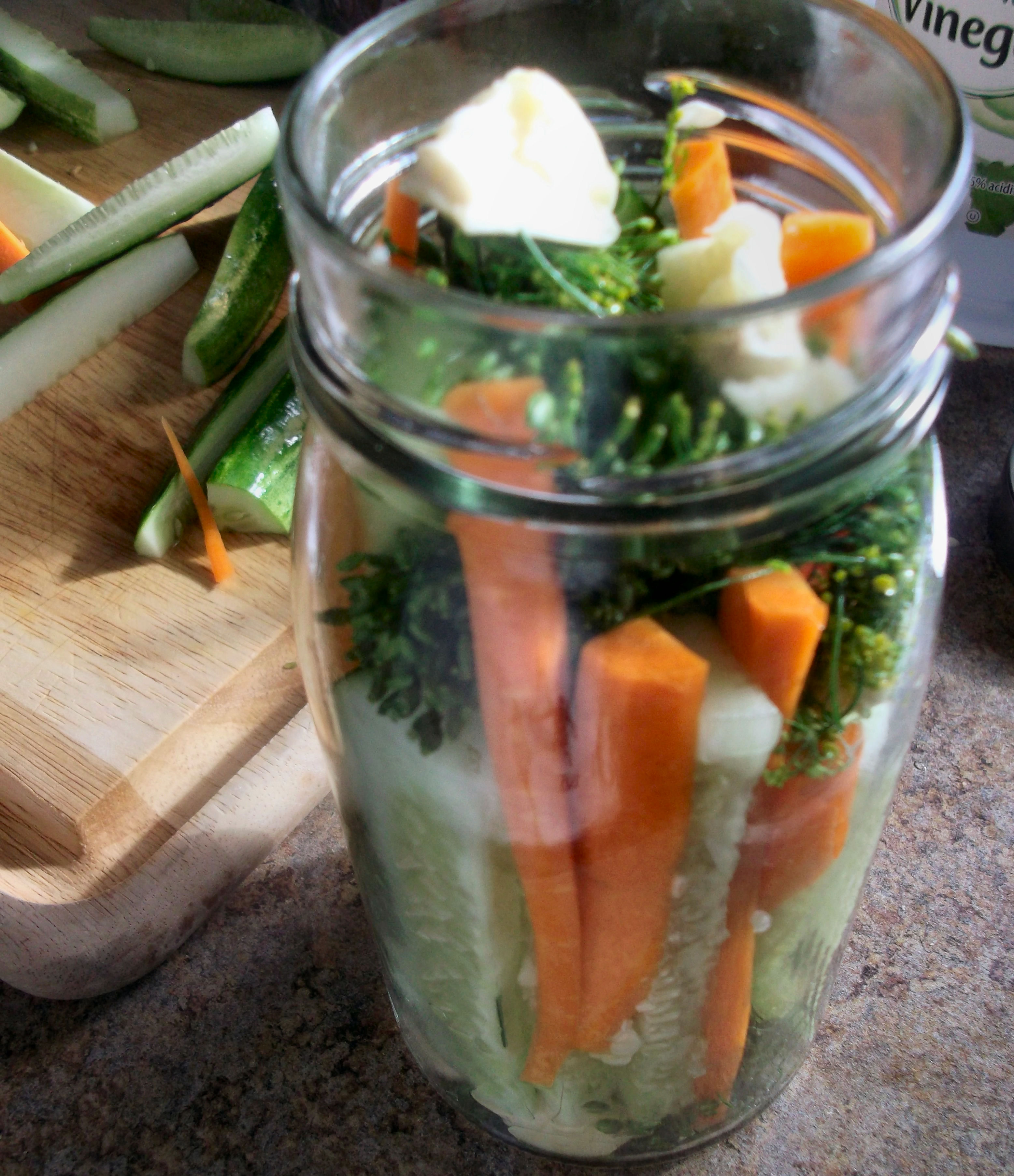 Pack the jar with the cucumber and carrot spears (holding the jar at an angle makes this step a little easier). Pack the jar until nothing more fits, and then press in another clove or two of garlic and some more dill on top.