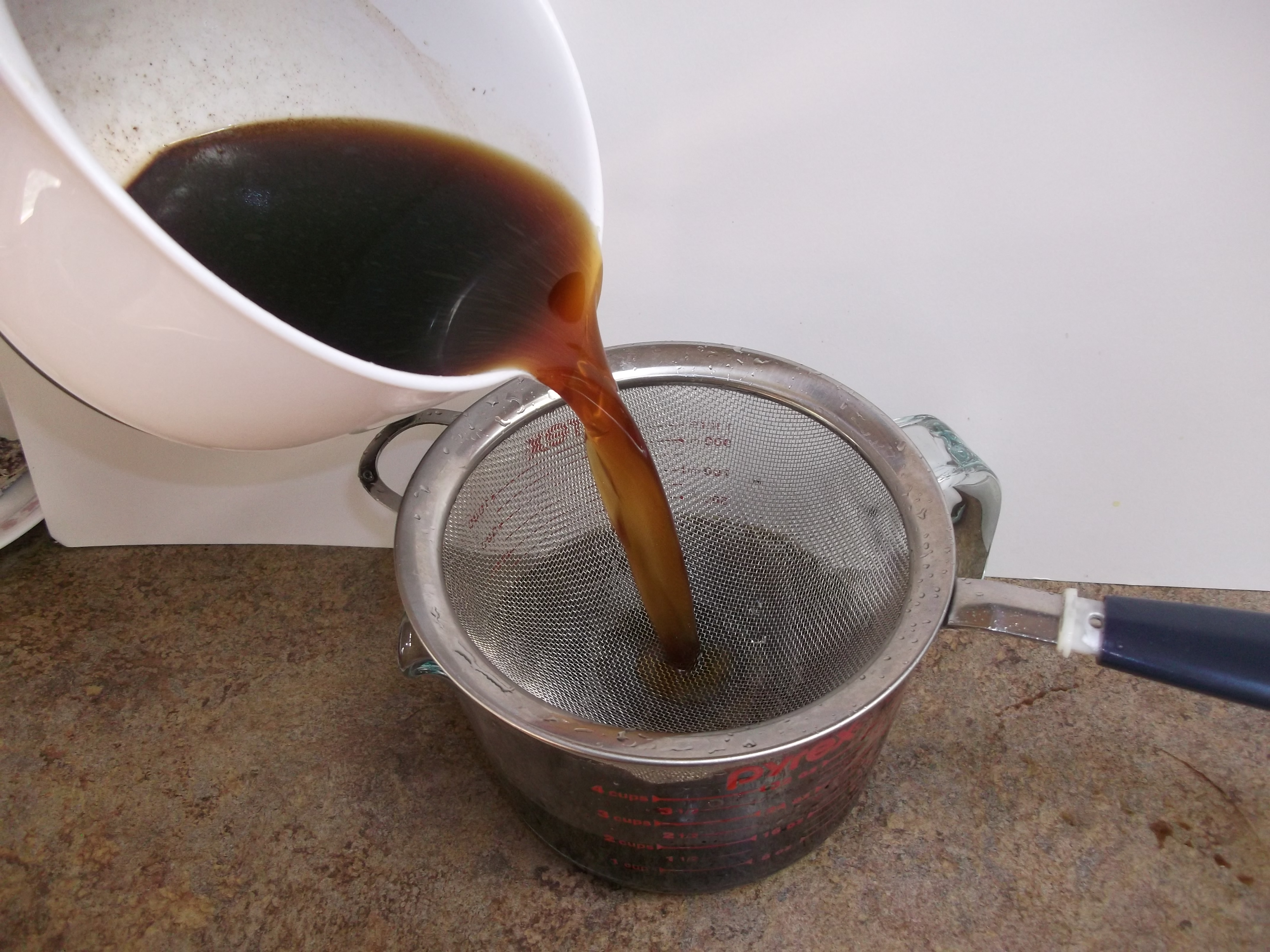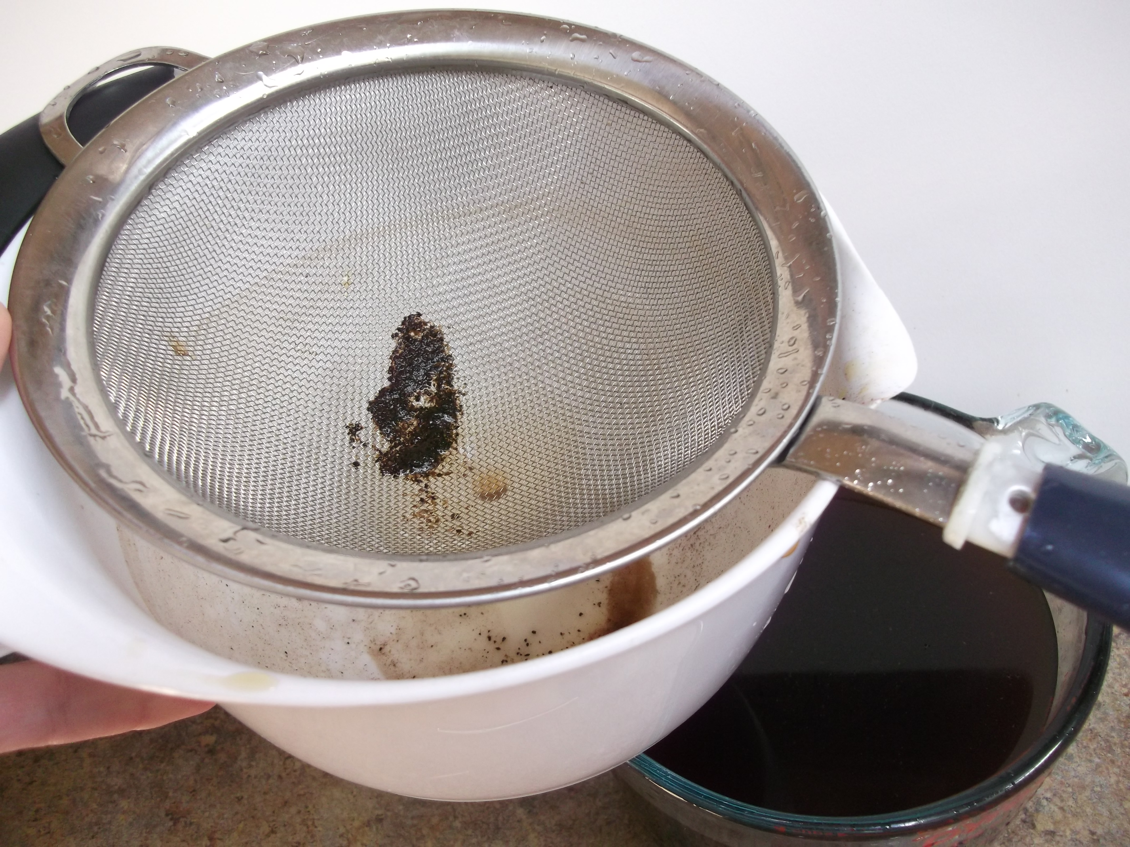 After the waiting period, pour the contents through a fine-mesh sieve into a 1-quart bowl or container. Gently press on the coffee grounds to extract as much liquid as possible. Discard the grounds, rinse the sieve and the original container, and strain the coffee back into that container.