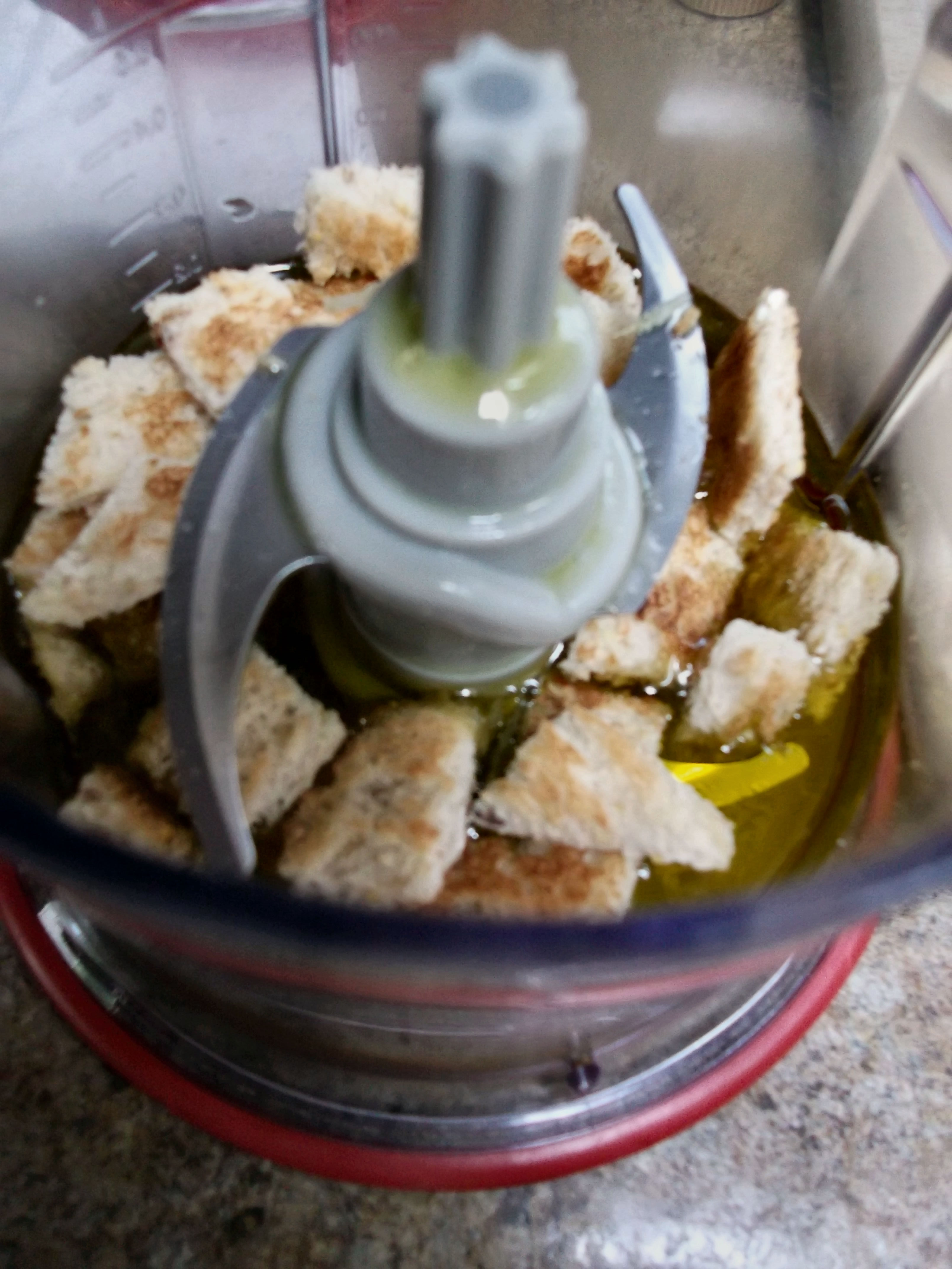 In a food processor or blender, place the bread pieces, extra-virgin olive oil and lemon juice.