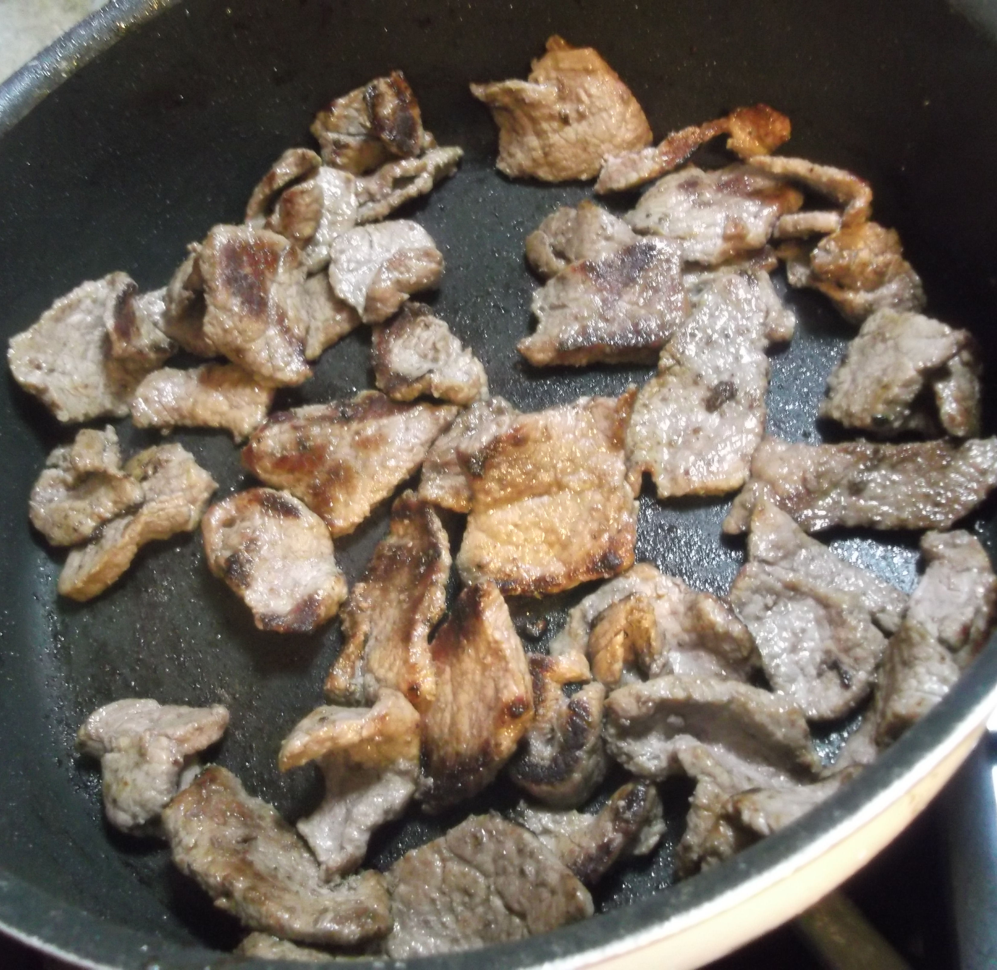 Dry the steak pieces and season with pepper. Sear the pieces until nicely browned on both sides. Work in batches so as not to overcrowd the pan: too many pieces will just cause them to steam each other rather than brown.