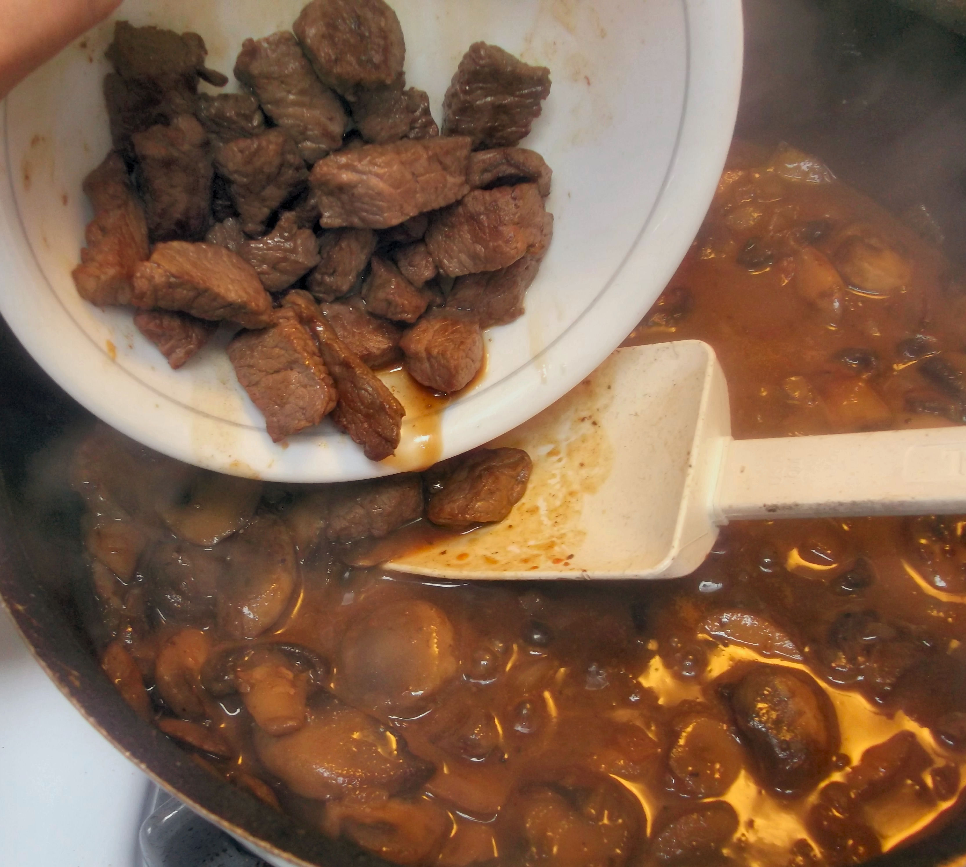 Beef Stroganoff 053Add the mustard paste, stir, then add the wine/vermouth and cook until evaporated. Pour in the beef/mushroom broth mixture and bring to a simmer, scraping the bottom of the pan with a wooden spoon (or a rubber spatula, if you’re a kitchen rebel like me) to loosen any browned bits.