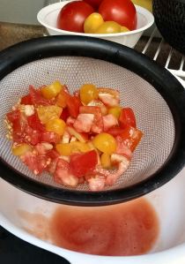 Place a colander over the same large bowl you just put the seeds in, and add the tomatoes to the colander. Gently stir to mix, and allow them to drain for 15-30 minutes.