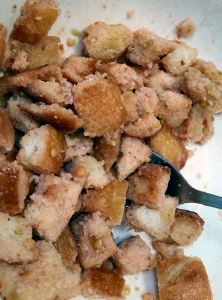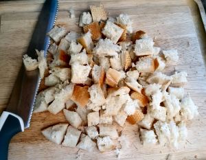 While the garlic is sizzling and filling your kitchen with incredible aromas, cut or tear the bread into cubes.
