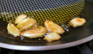 For the bread: Browning the garlic in olive oil is kind of an optional step, but it really adds some nice flavors to the finished salad. Brown the smashed cloves over medium-low heat. (My rule of thumb is 1 tablespoon olive oil plus 1 smashed clove of garlic per every 1 cup of bread cubes. I use these as croutons in my gazpacho, too!)