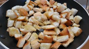 (Alternatively, toast the bread cubes in the oven: Toss bread cubes with olive oil and arrange in single layer on rimmed baking sheet. Toast bread pieces at 400 degrees F until just starting to turn light golden, 15 to 20 minutes, stirring halfway through.)