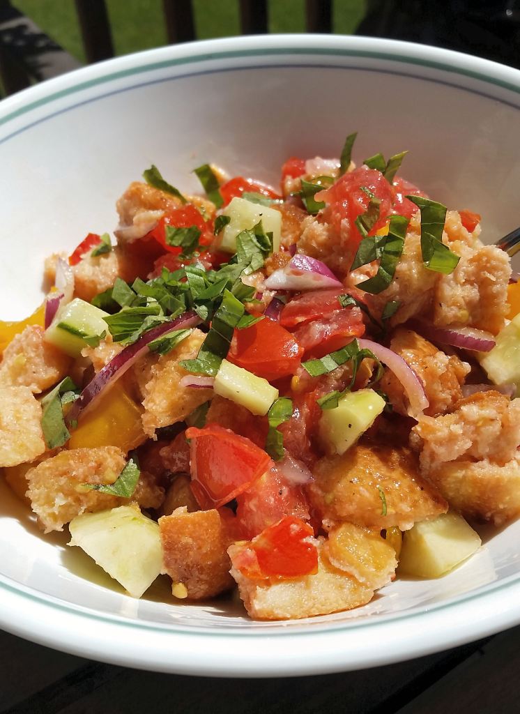 One of my favorite summer restaurant meals is Panzanella: an Italian bread and tomato salad bursting with fresh, in-season summer tomato flavor. With my bounty of tomatoes coming in, I thought it was high time I start making my own version of this to enjoy at home.