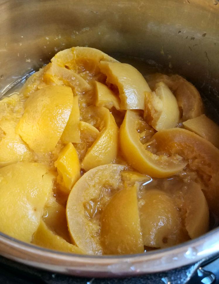 Marmalade uses the entire fruit – rind and all – so be sure to wash each piece very well before you begin. I soak mine for about 10 minutes in a sink full of water with some vinegar to clean them and remove any pesticides.