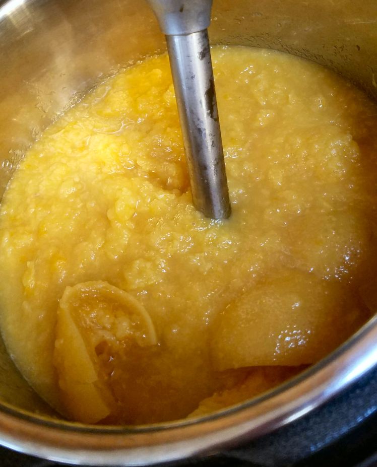 Now it’s time to break up the orange peels/rinds into tiny chunks. You can either process the fruit (in batches) in a blender/food processor or use an immersion blender right in the IP.