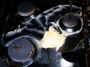 13) Don’t put a lid on the pot when making ghee. Or at least don’t leave the kitchen if you do. I set a lid on the pot and it boiled over and made a mess of my stovetop. It was easier to clean once it solidified, but what a waste of yummy ghee!
