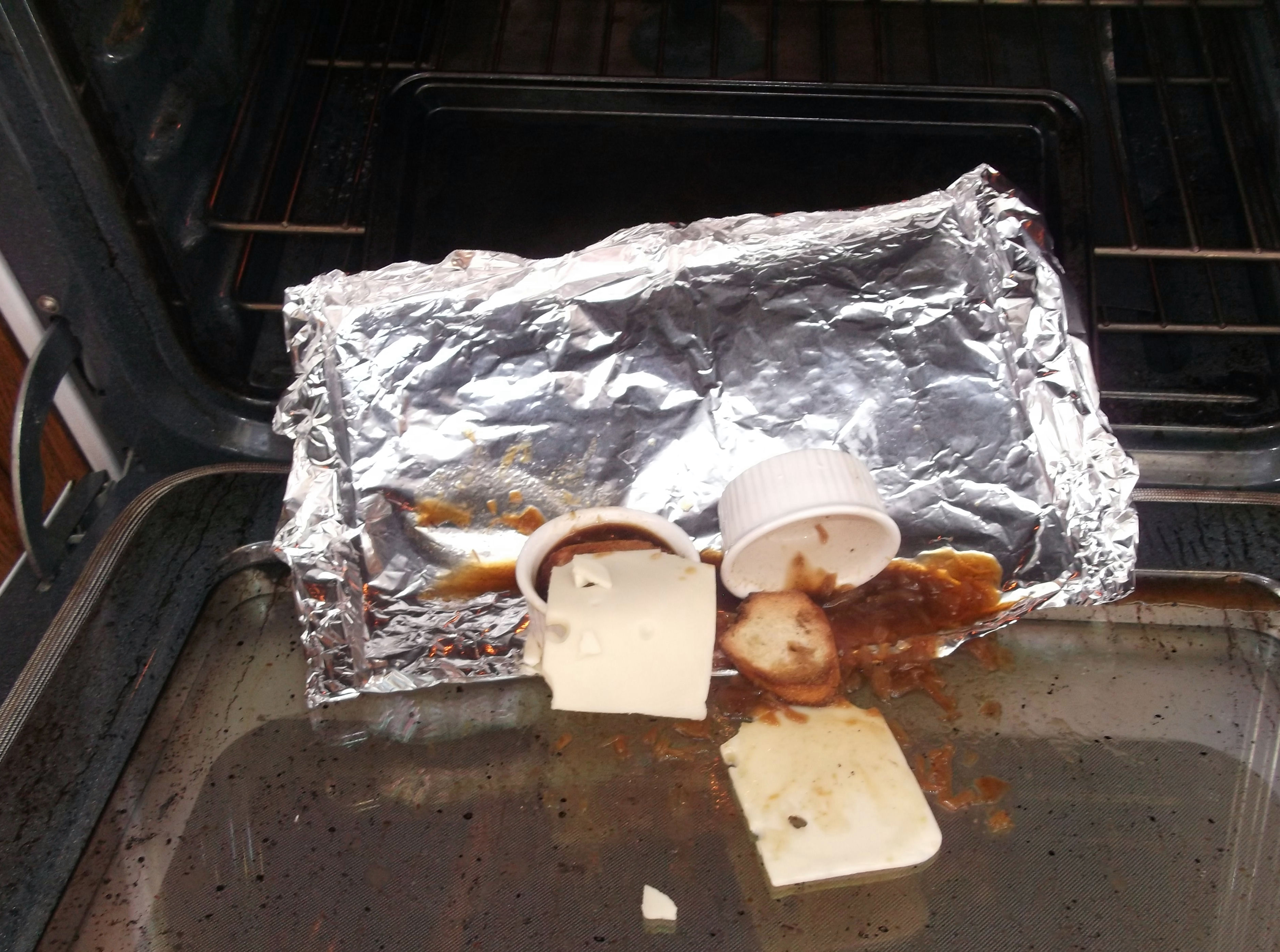 10) When placing the cheese-laden French Onion soup crocks in the oven, dropping the pan and spilling the soup all over the inside the oven is NOT a good idea.